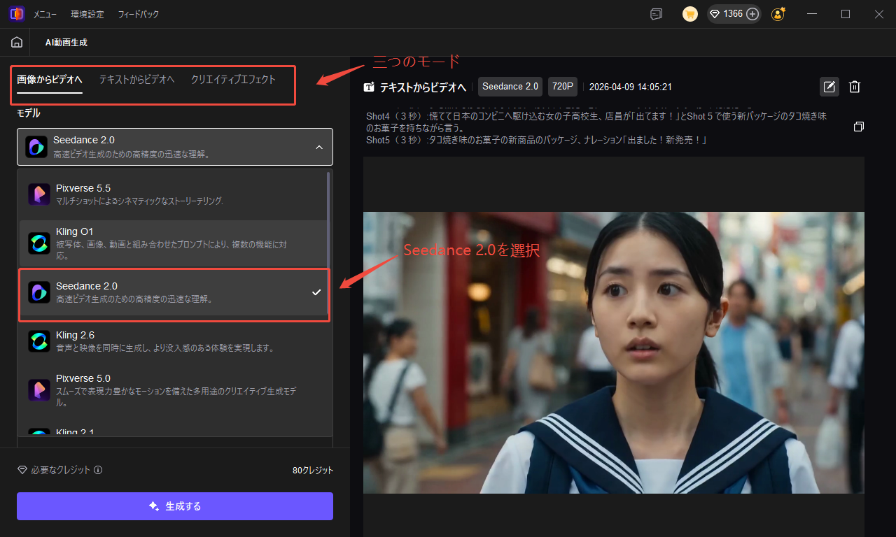 ステップ3:「画像から動画生成」、「テキストから動画生成」と「クリエイティブエフェクト」という三つのモードが選べられます。ここでSeedance 2.0を選択します。