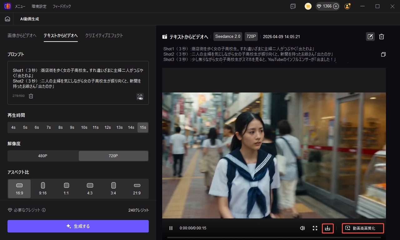 ステップ5:生成した動画は右のメニューに表され、ダウンロードあるいは高画質化を実行できます。