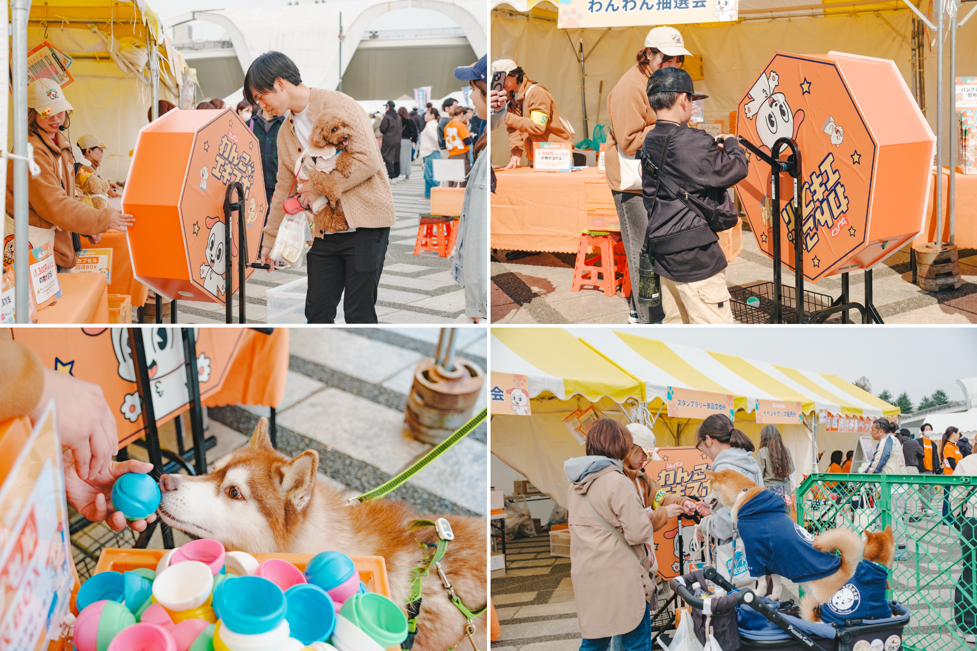 イベントの大人気企画「わんわん抽選会」では、大人の背丈ほどの高さを誇る巨大抽選機が会場の注目を集め、来場者を大いに楽しませました。順番を待つ間も期待に胸を膨らませる様子が見られ、抽選機を回すたびに笑顔と歓声が広がりました。愛犬と一緒に並ぶご家族の姿や、楽しそうに過ごすわんちゃんたちの様子も各所で見られ、会場全体が笑顔と熱気に包まれる大盛況のひとときとなりました。