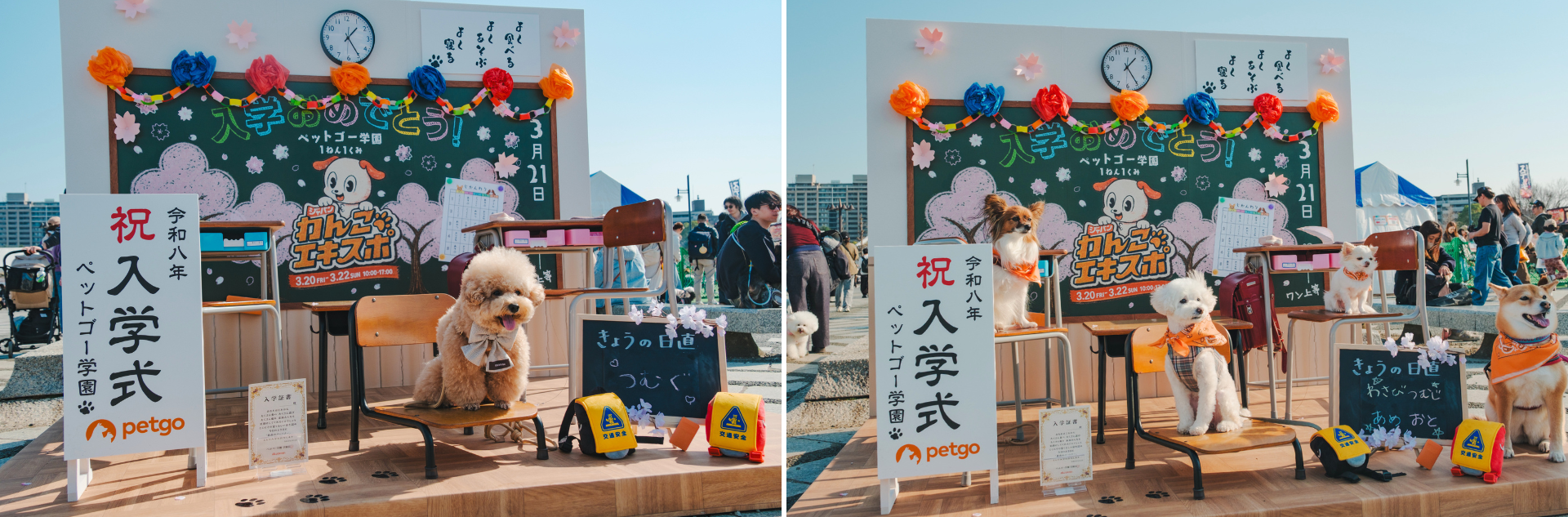 ペットゴー株式会社協賛のフォトスポットでは、教室風のセットの中で、多くのわんちゃんたちが入学式風の記念撮影を楽しみました。ランドセルを背負った愛らしい姿も多く見られ、飼い主の皆さまにもご好評をいただきました。また、ご自身の愛犬の名前を黒板に書ける演出も人気を集め、思い出に残る一枚を撮影できると喜ばれていました。さらに、フォトスポットで配布された入学証書も好評で、一緒に写真を撮影される姿が多く見られました。
