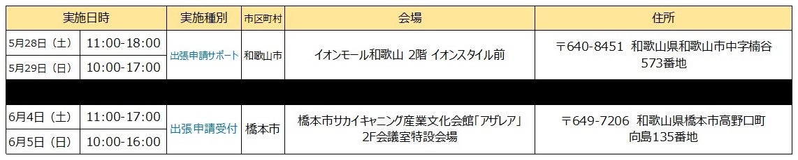 ※開催場所の調整状況や新型コロナウィルスの感染状況等により、「出張申請受付」及び「出張申請サポート」の開催を中止・延期、または実施内容が変更となる可能性がございます。
