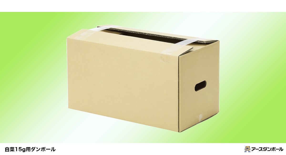 白菜15kg用の段ボール箱がアースダンボールから新登場。天面に開口部を設け、野菜や果物の輸送を目的とした梱包資材