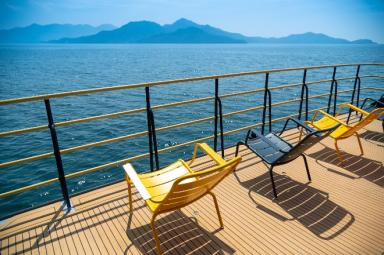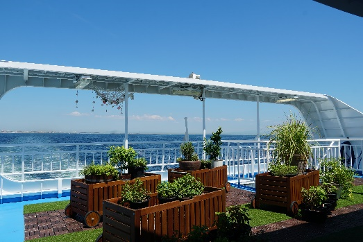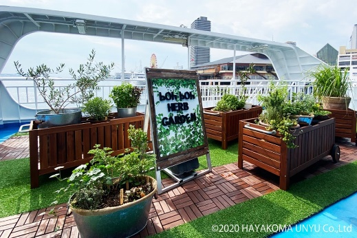 2FプライオリティゾーンではYogiboに寝転がりながら、神戸港から見る大パノラマビューを満喫していただけます。3Fオープンデッキでは新たなプロジェクトに取り組んでおり、チーズや乳製品、自家菜園などで有名な弓削牧場様のご協力のもと船上ハーブガーデンをお客様に楽しんでいただけるよう、愛情を注ぎながらハーブの育成に挑戦しています。また1Fカフェではそれらのハーブを使ったオリジナルフードやドリンクがご堪能いただけます。