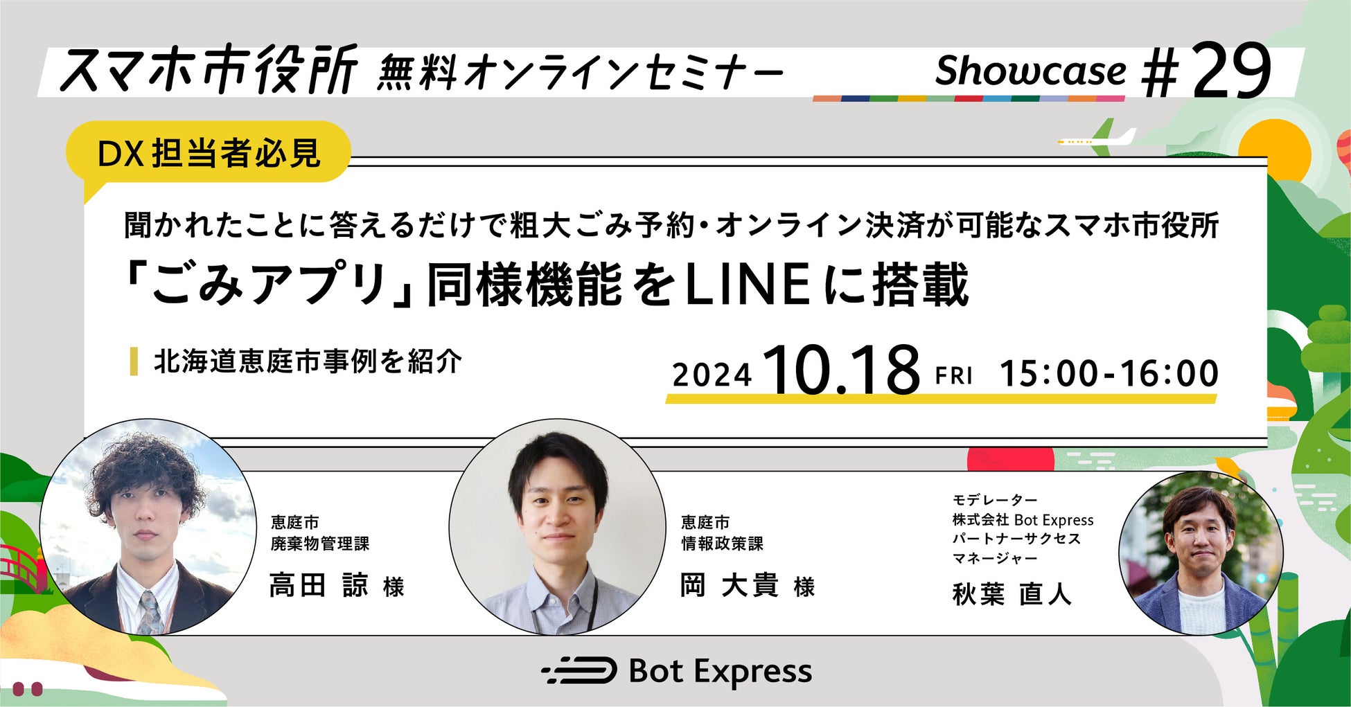 株式会社Bot Express(本社:東京都港区、代表取締役:中嶋 一樹、以下 Bot Express)は、スマホ市役所を実現している官公庁・地方自治体の事例を共有する無料オンラインセミナー「Bot Express Showcase」を毎月開催しています。10月18日の開催が決定しましたのでお知らせいたします。