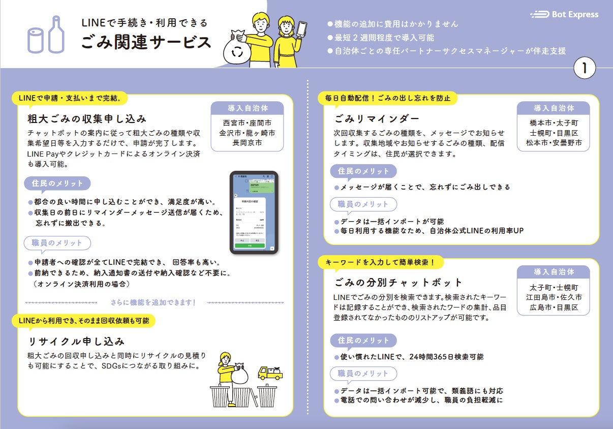 ごみ収集日通知、ごみ分別チャットボット、粗大ごみ申請、家庭・事業系持ち込み予約、不法投棄通報、生ごみ処理機等普及事業補助金、ボランティアごみ袋回収連絡、ごみ収集漏れの連絡、小型家電回収場所検索、ごみ分別職員問い合わせなど