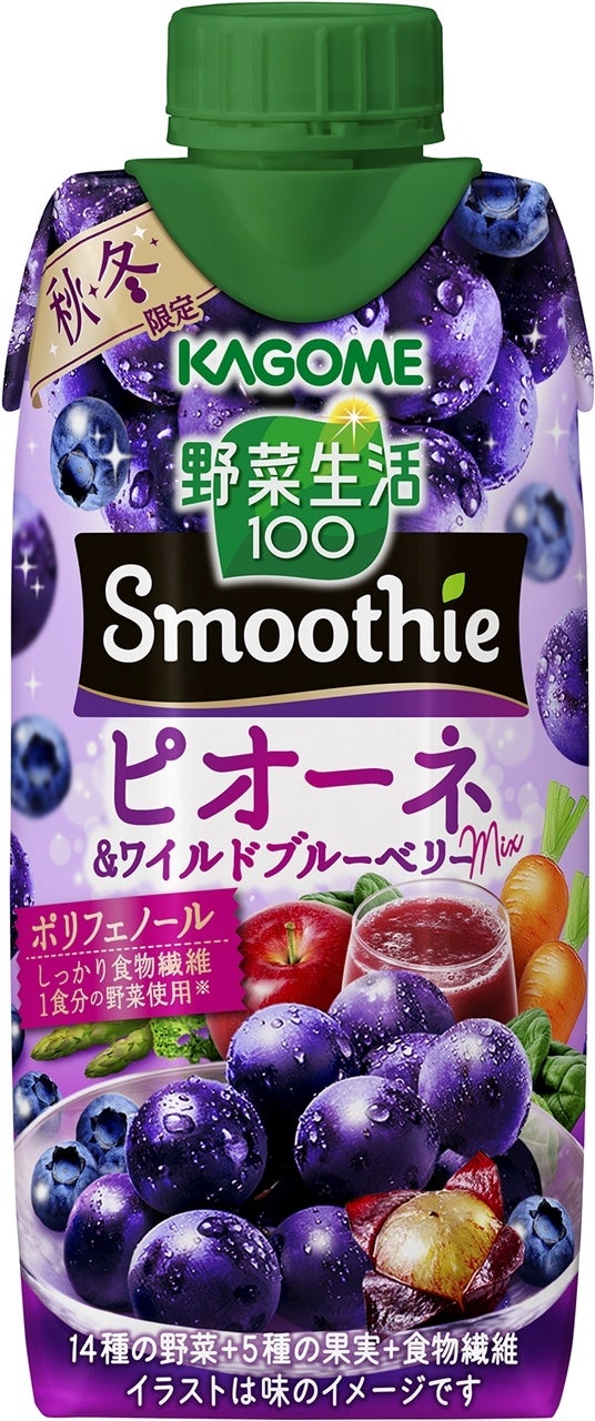 秋冬限定で発売する「野菜生活100 Smoothieピオーネ&ワイルドブルーベリーMix」は、ピオーネの芳醇でさわやかな味わいとほのかなワイルドブルーベリーの味わいをお楽しみいただけます。1食分の野菜(120g分)を使用※1し、しっかり食物繊維とポリフェノールが摂れます。