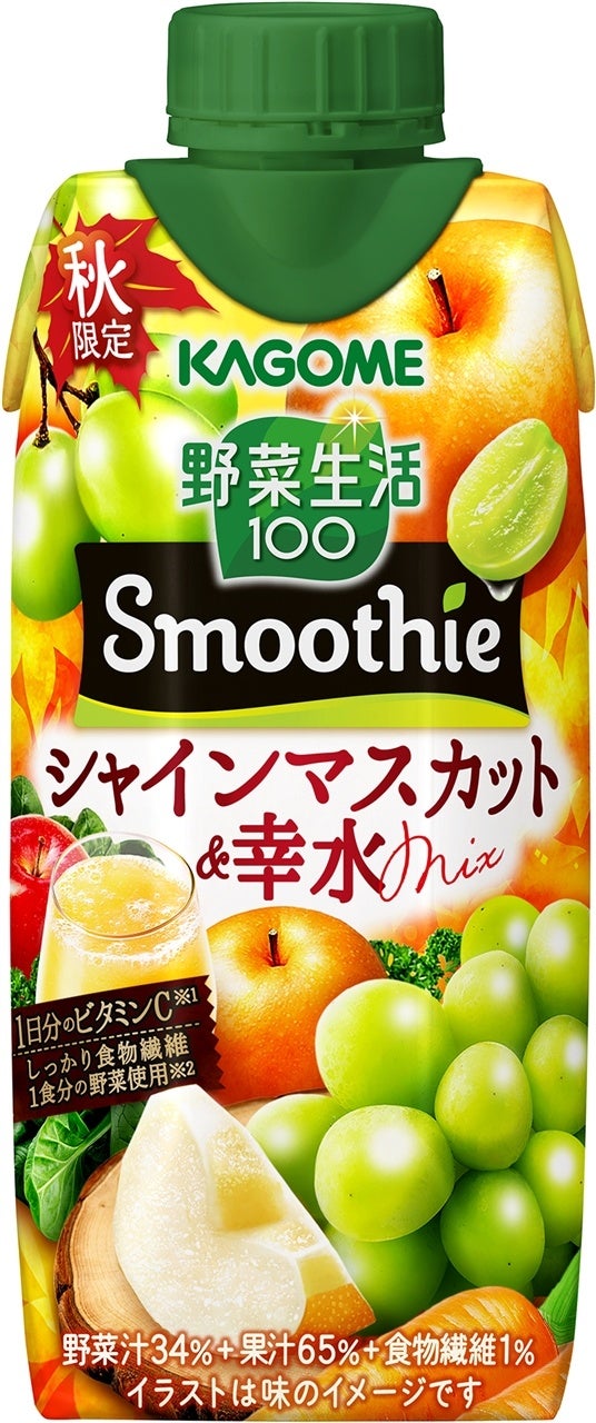 秋限定で発売する「野菜生活100 Smoothie シャインマスカット&幸水Mix」は、シャインマスカットの爽やかな甘みと幸水の余韻を感じるおいしさをお楽しみいただけます。1食分の野菜(120g分)を使用※1し、しっかり食物繊維と1日分のビタミンC※2が摂れます。