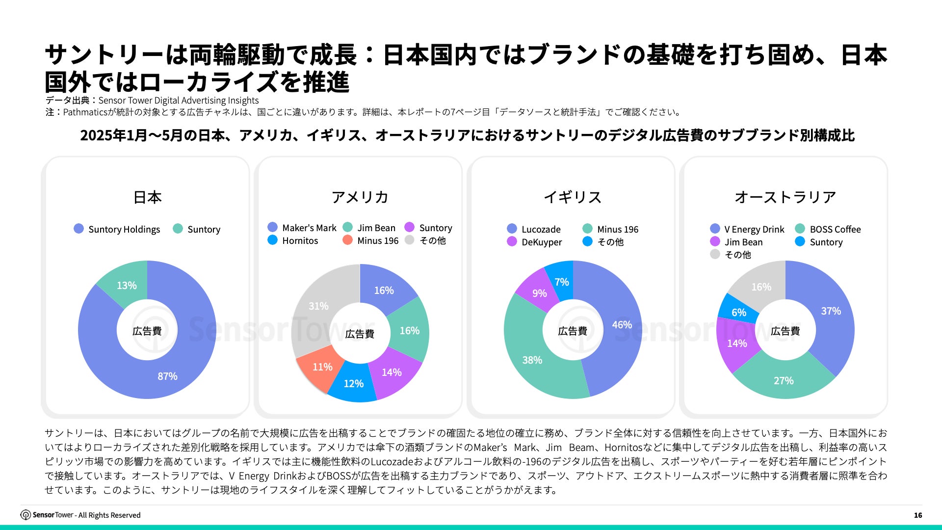 サントリーは一貫して地域の消費傾向を確実に捉えて事業セグメントと市場の両方から働きかけ、各地域の飲用文化に柔軟に対応しています。サントリーはアメリカでは傘下の酒類ブランドのMaker’s Mark、Jim Beam、Hornitosなどに集中してデジタル広告を出稿し、利益率の高いスピリッツ市場での影響力を高めています。イギリスでは主に機能性飲料のLucozadeおよびアルコール飲料の-196のデジタル広告を出稿し、スポーツやパーティーを好む若年層にピンポイントで接触しています。オーストラリアでは、V Energy DrinkおよびBOSSが広告を出稿する主力ブランドであり、スポーツ、アウトドア、エクストリームスポーツに熱中する消費者層に照準を合わせています。このように、サントリーは現地のライフスタイルを深く理解してフィットしていることがうかがえます。