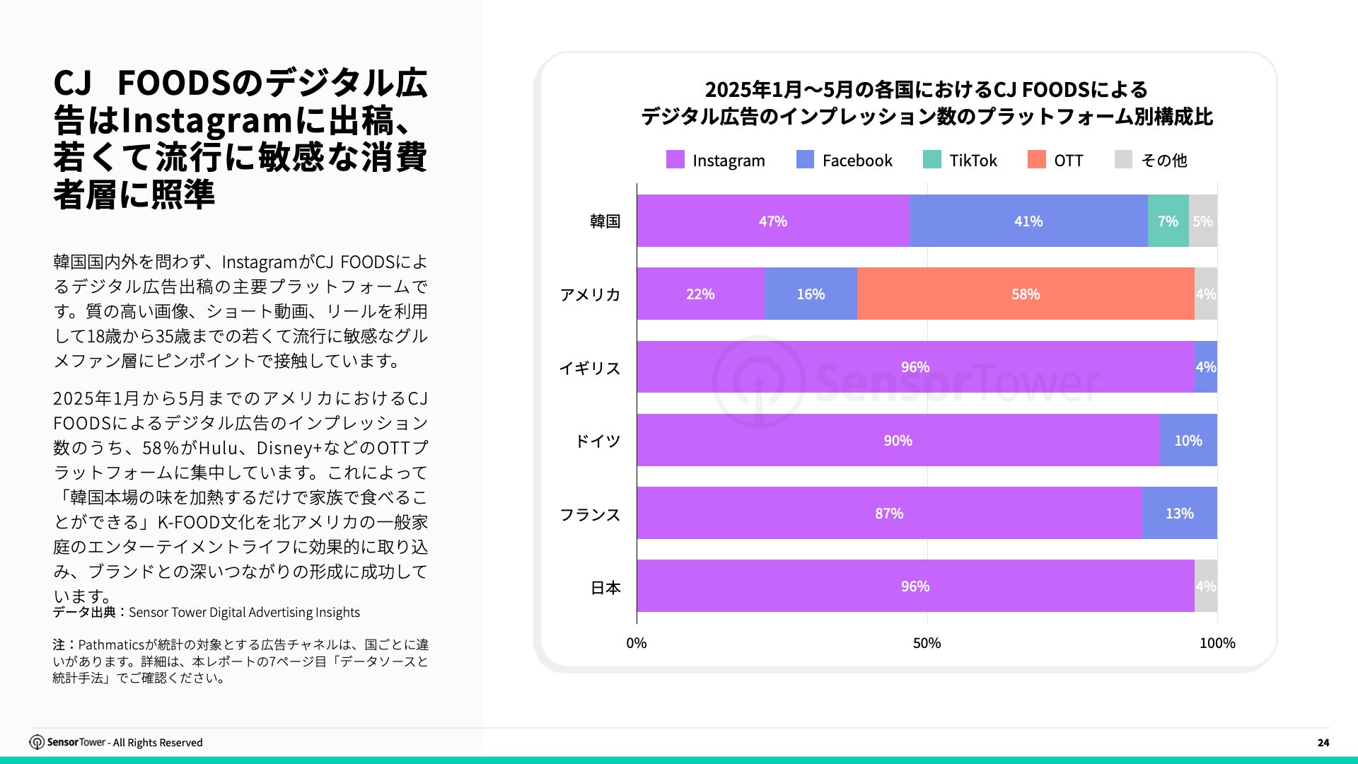 2024年6月から2025年5月までのアメリカにおける食品・飲料関連のデジタル広告費は66億ドルに達し、インプレッション数は7,200億に迫っています。アメリカは世界で最も消費力が高い国であることから、APAC地域のブランドによる国外向け広告出稿における一番の要地になっています。サントリー、CJ FOODSなどの企業もアメリカ向けの予算を増してブランド認知度および市場シェアの向上を図っています。