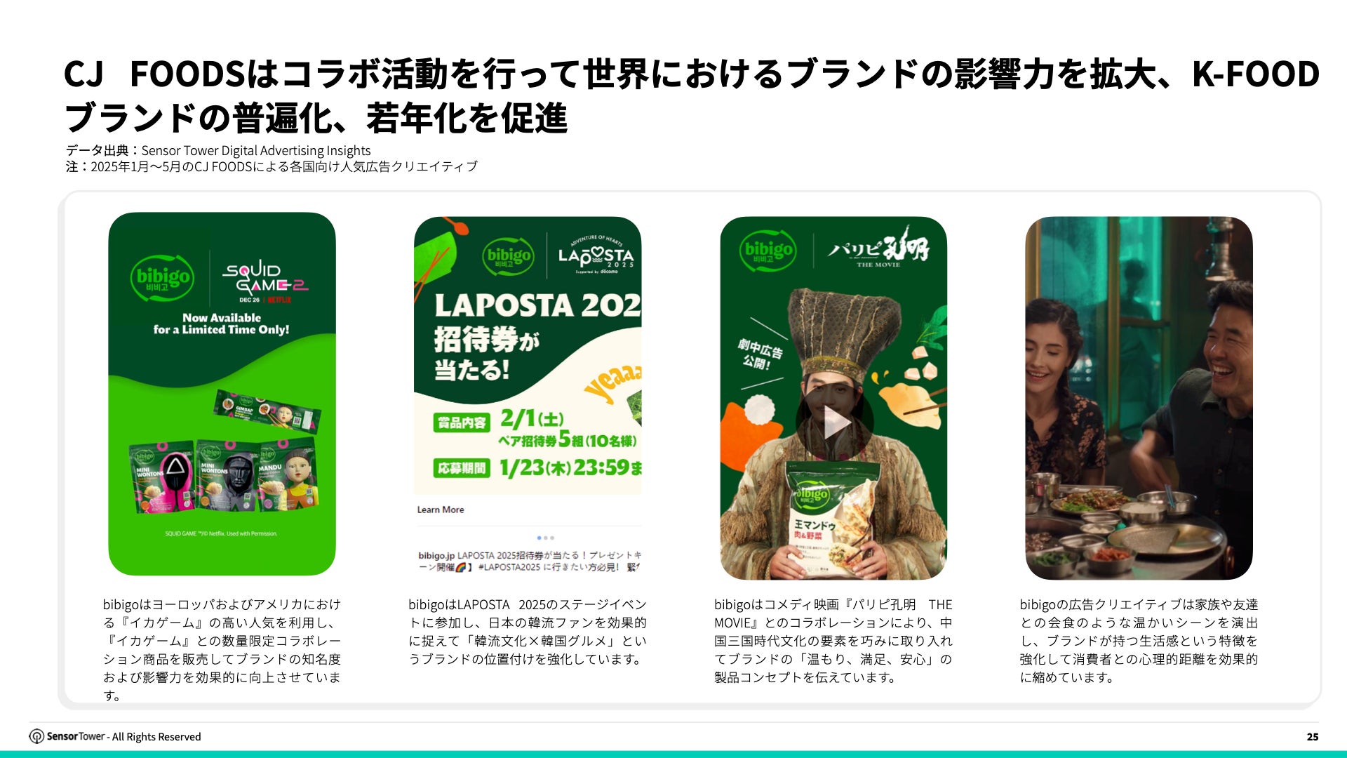 CJ FOODSは韓国ドラマ『イカゲーム』、K-POPグループのイベント、人気映画のIPなどの文化資源を活用し、ヨーロッパ、アメリカ、日本において話題性の高いコラボレーションマーケティングを展開してbibigoの世界での影響力およびブランド好感度を効果的に向上させています。「文化×グルメ」という業界の枠組みを超えたコラボレーションは、K-FOODブランドの若年化、グローバル化の重要な広告戦略になっています。