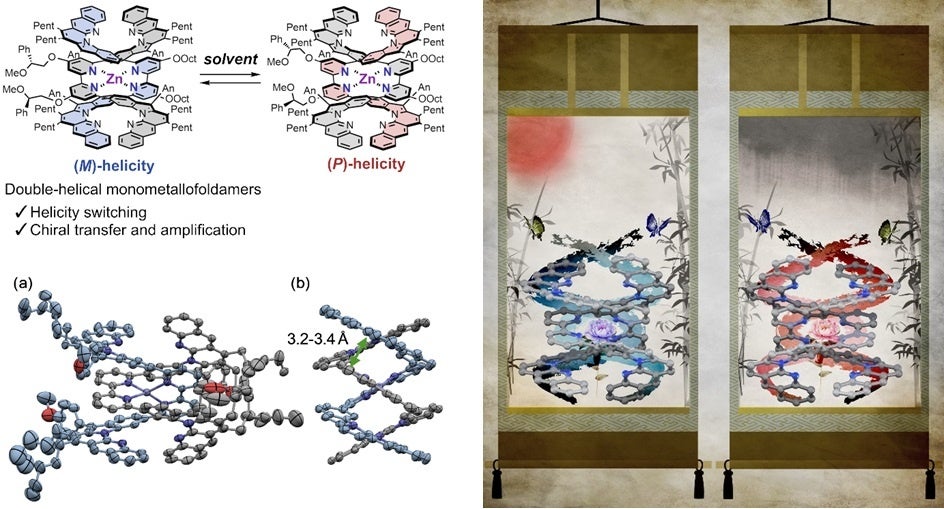 二重螺旋構造を有する亜鉛(Zn)単核錯体を合成し、使用する溶媒の性質によって螺旋の左右の巻き方向の反転が起こることを明らかにしました。