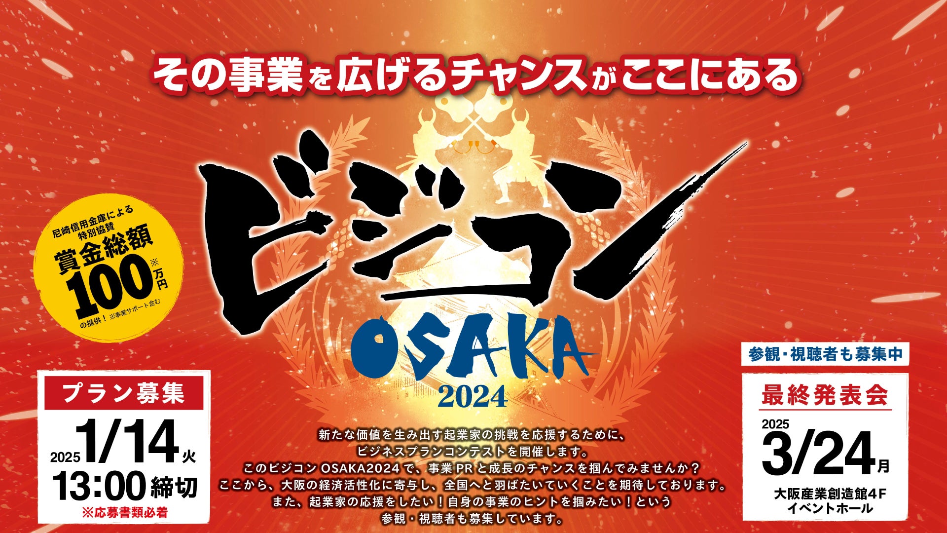 大阪産業創造館(公益財団法人大阪産業局)では、新たな価値を生み出す起業家の挑戦を応援するため、ビジネスプランコンテスト「ビジコンOSAKA 2024」を開催します。