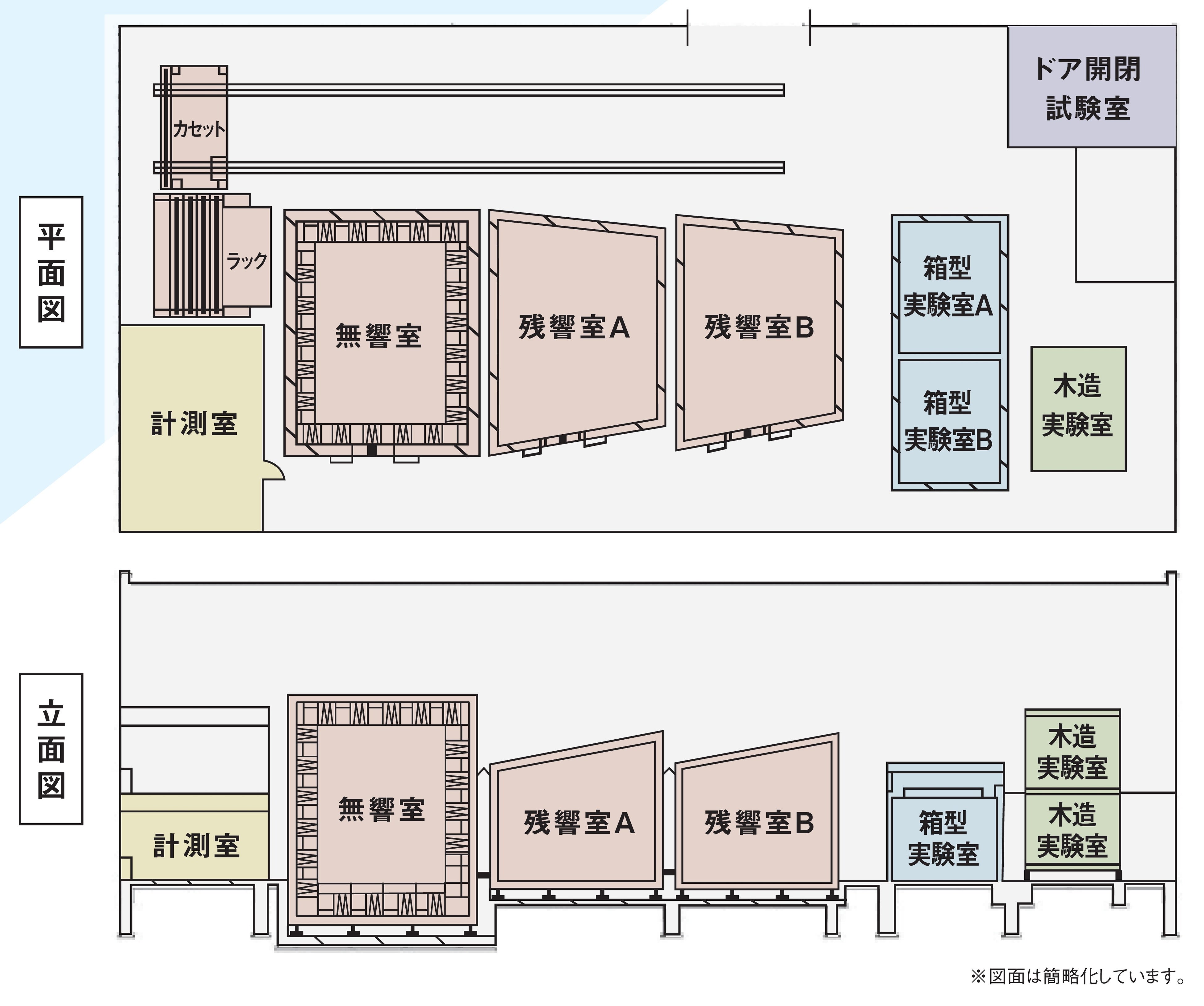 『音ラボ』は、建築材料や構造の基本的な音響性能を測定する「残響室」、「無響室」、「箱型実験室」に加え、木材利用の観点から今後の需要増加が見込まれるCLTを構造躯体に用いた「木造実験室」を備える実験棟です。各実験室には高性能の実験・測定装置を設置しており、音に関わる様々な実験・性能評価が可能です。