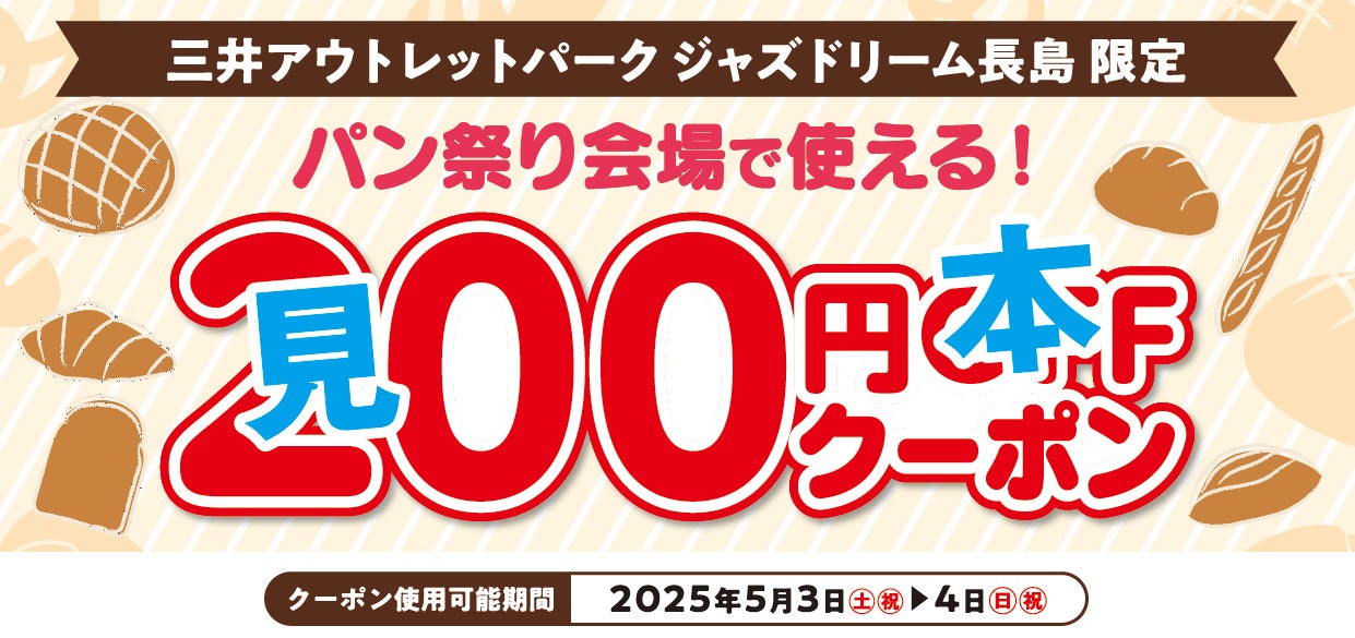ジャズドリーム長島にてパン祭り開催期間中、同施設内で5,000円以上(税込・合算可)お買上げいただいただいたレシートと、三井ショッピングパークポイント公式LINEアカウント(https://page.line.me/576hevgq)の友だち登録画面を1Fセンタープラザ横「特設引換ブース」にてご提示いただくとパン祭り会場で使える200円分クーポンをプレゼント!