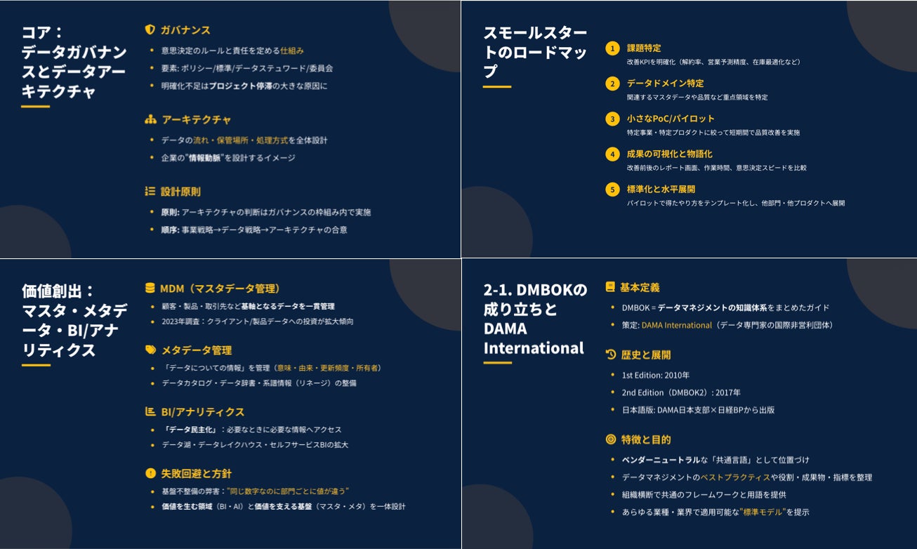 本資料では、DMBOKの基本から実務での使い方まで、日本企業の現場感も踏まえながら分かりやすく解説していきます。