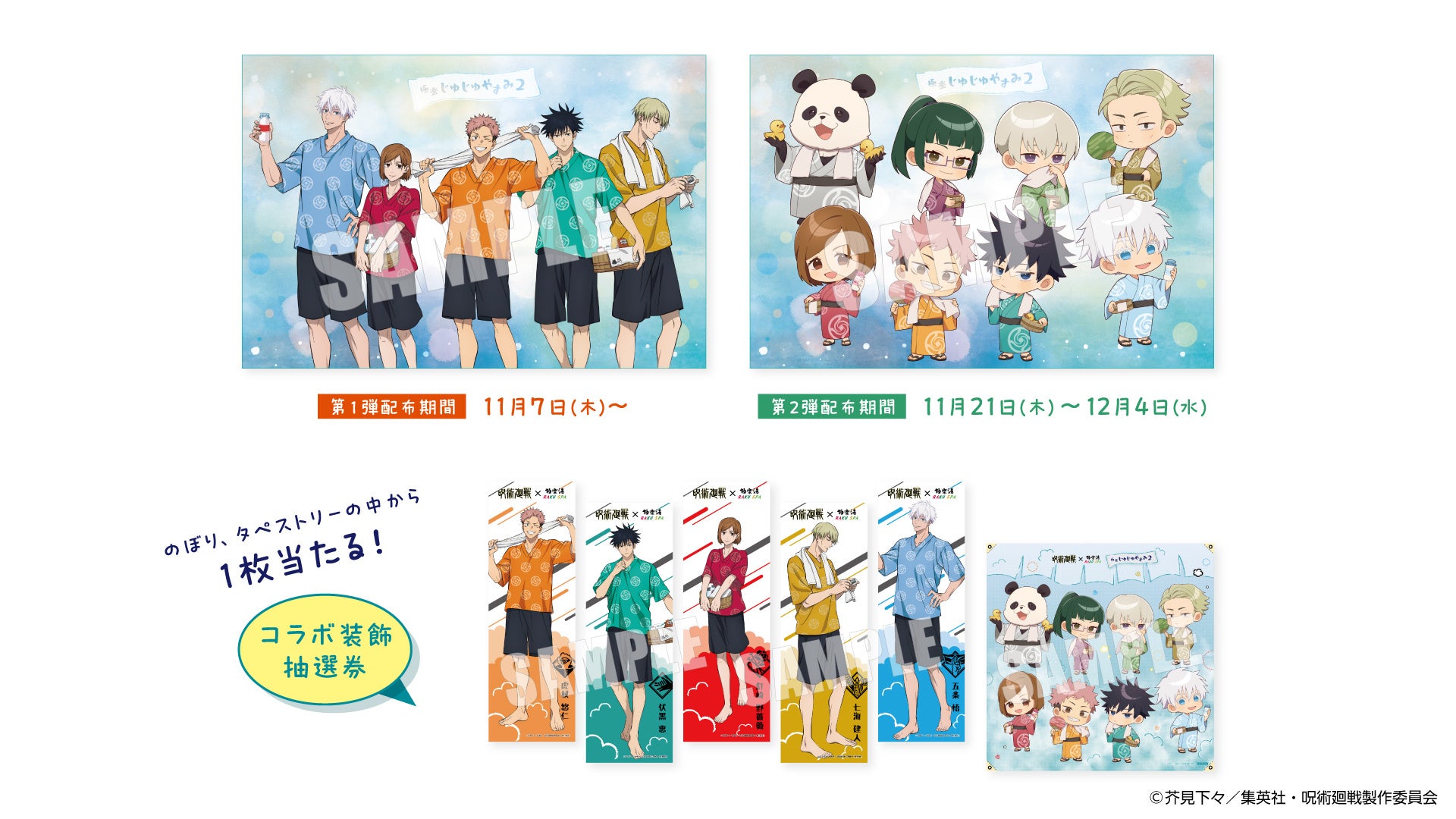 株式会社極楽湯(本社:東京都千代田区、代表取締役社長:佐藤 剛史)は株式会社GK Marketing(本社:東京都千代田区、代表取締役社長:山本 真司)と共同主催で、2024年11月7日(木)より極楽湯・RAKU SPAグループ12店舗にて、TVアニメ『呪術廻戦』とのコラボキャンペーン第二弾“極楽じゅじゅやすみ2”を開催いたします。