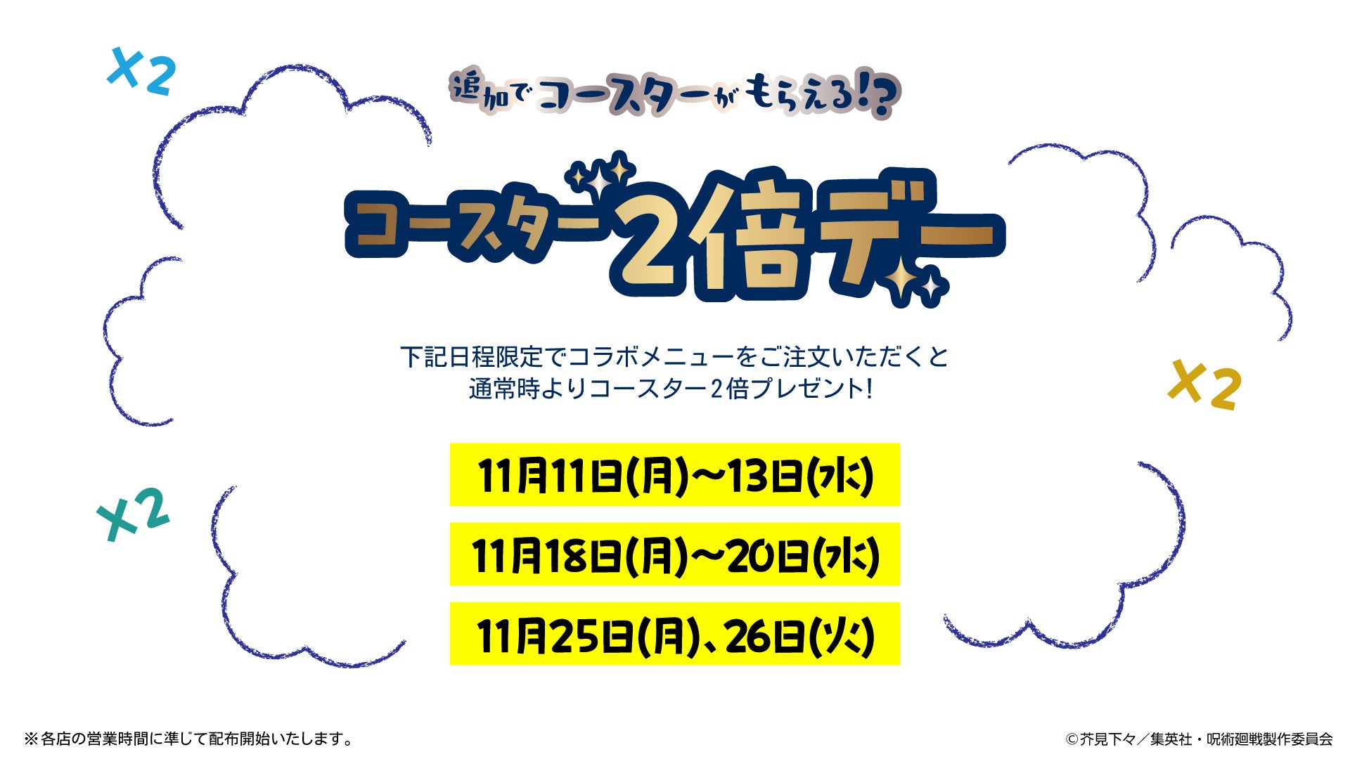 コースター2倍デー期間にコラボメニューをご注文いただくと、通常の倍の枚数のコースターをプレゼントします。