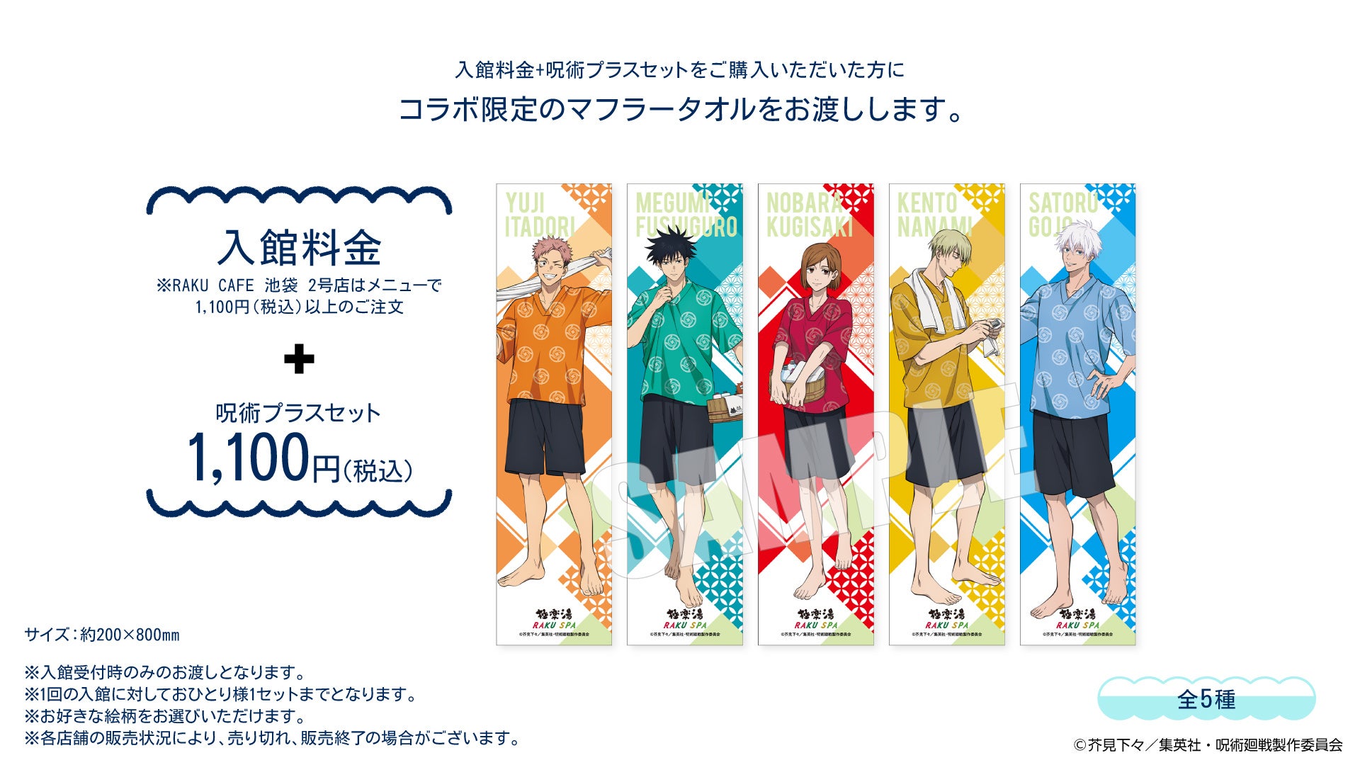 店舗ご入館時に、入館料金+呪術プラスセットの料金をお支払いいただいた方に、描き下ろしビジュアルを使用したコラボ限定マフラータオルをお渡しします。