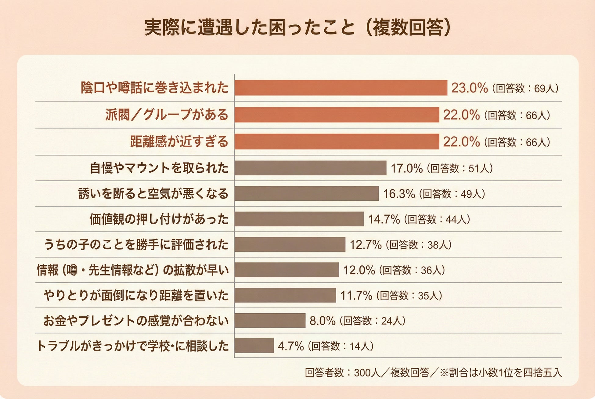 PTA・役員・係活動も3割近くを占め、強制力のある役割が大きな負担になっていることが分かります。断れない、辞められない、意見が言いにくい――こうした環境下での人間関係は、通常の友人関係以上にストレスフルです。