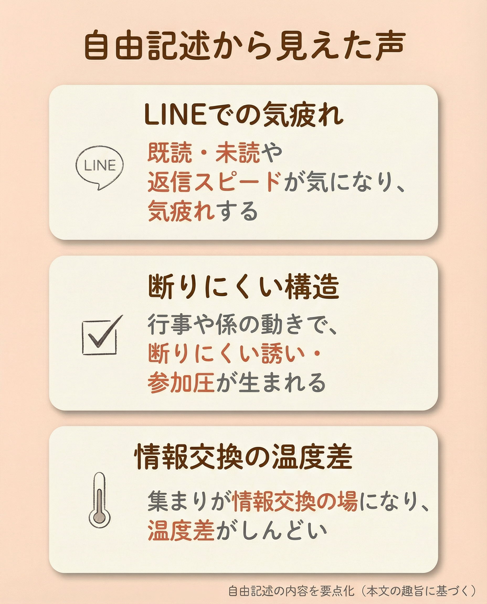 【結果7】自由記述から見えた声――LINEの既読プレッシャー、断りにくい誘い、情報交換の温度差
