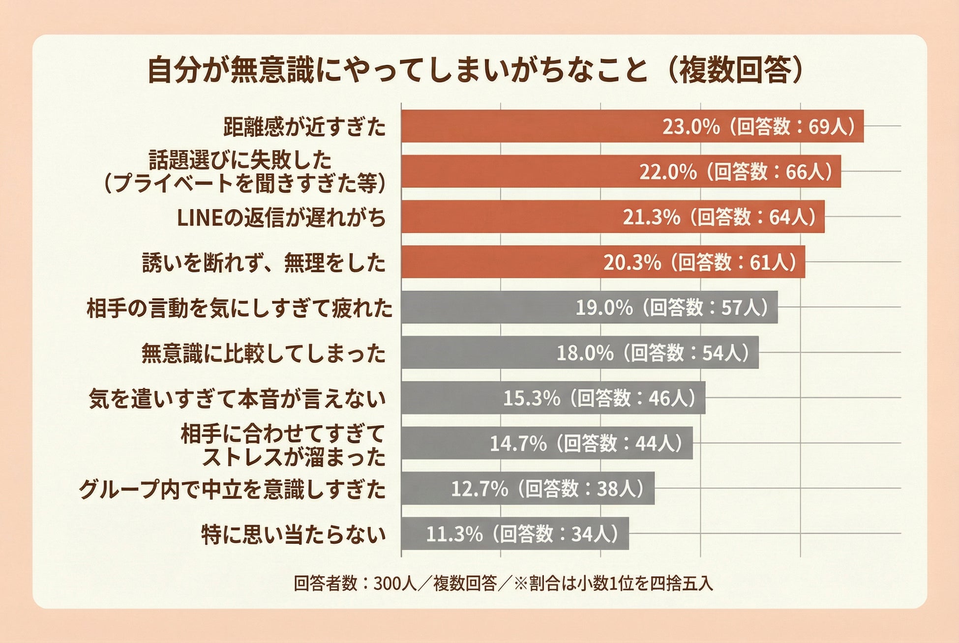 自分自身が無意識にしてしまいがちなことを複数選択で聞くと、相手に悪意を向けるというより、距離の取り方やコミュニケーションの癖に関する項目が上位になりました。