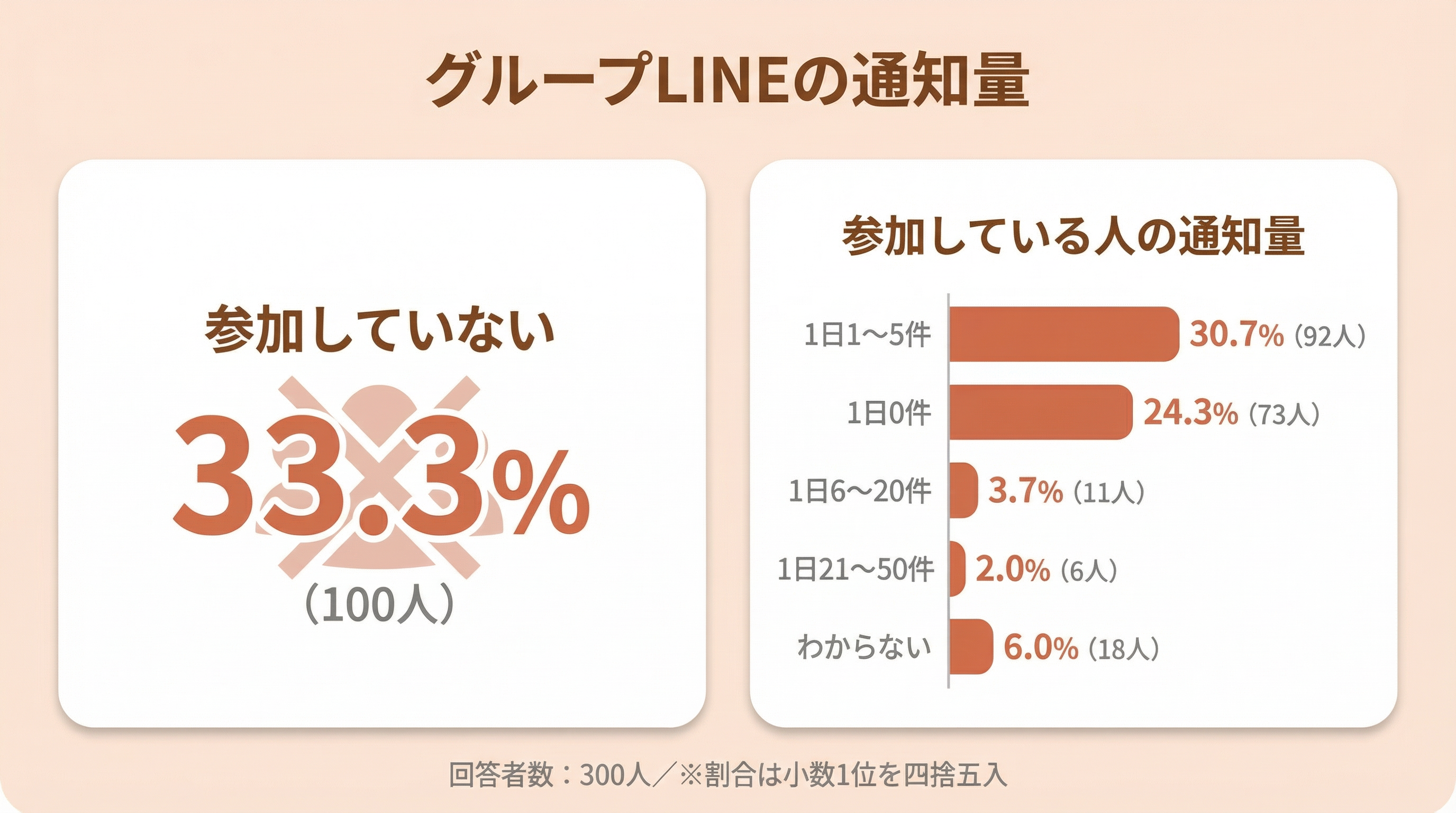 ・グループLINEの通知は参加していない33.3%(100人)。参加者でも1日0〜5件が中心