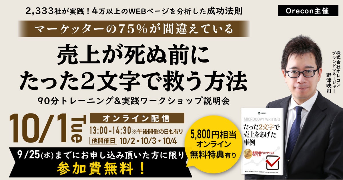 株式会社オレコン(本社:東京都港区、代表取締役:山本琢磨)は2024年10月開催:マイクロコピー1Dayトレーニング&マスタープログラム講座説明会の募集を開始しました。