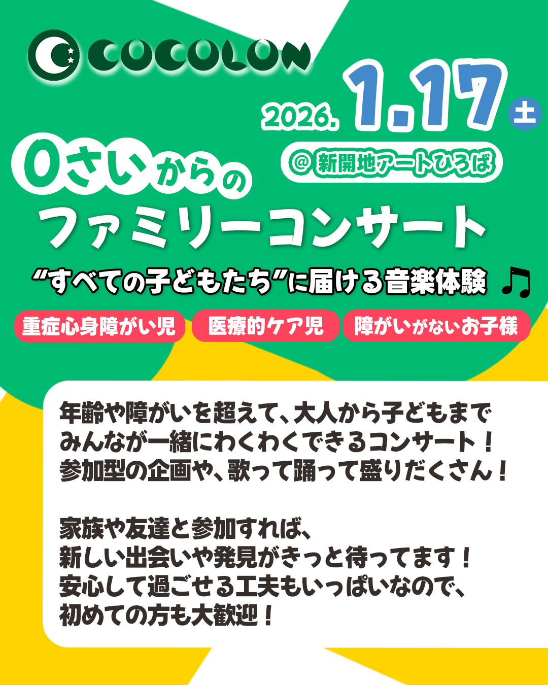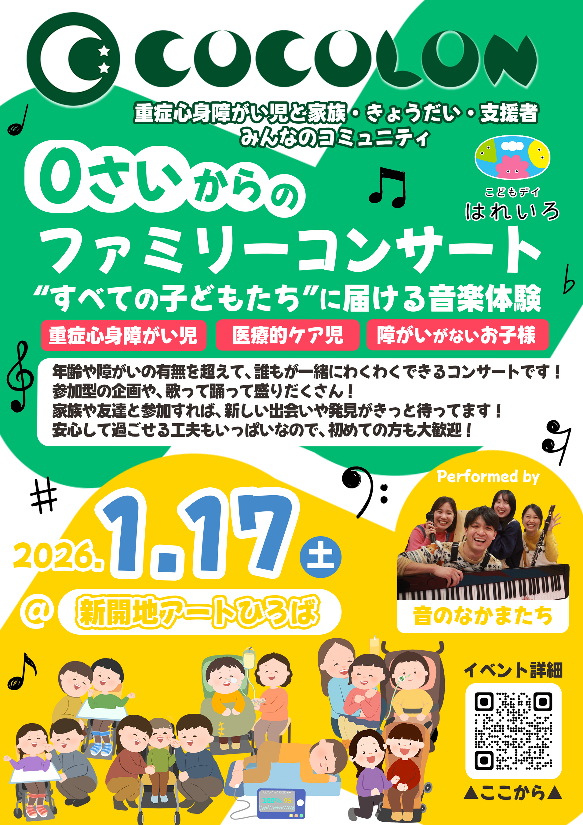重症心身障がい児のと家族や支援者向けに学び・遊び・情報を提供をする「COCOLON」(運営:特定非営利活動法人EPO、東京都江戸川区、代表:齋藤えりか)は、「0歳からのファミリーコンサート」を1月17日(土)に新開地アートひろば(神戸市兵庫区)で開催します。このイベントは、障がいや医療的ケアを抱えるお子様も近くで生の音楽を楽しむことができ、きょうだい児や家族と一緒に参加して楽しむことができ、障がいがないお子様・ご家族も参加することができます。