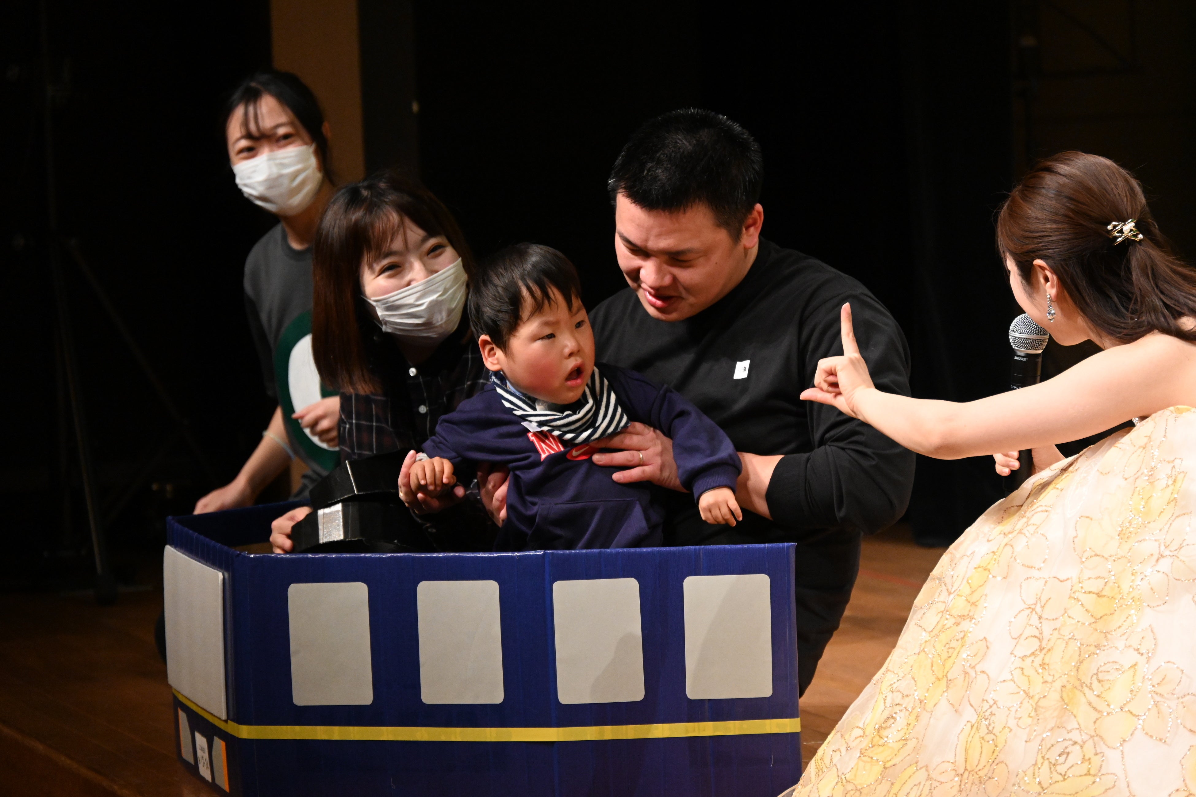 前回の公演は抽選で選ばれた家族が、舞台に上がって「バスにのって」の演目に参加するコーナーがありました。この日のために制作されたバスの模型と、運転手の帽子をかぶり、舞台上で体を動かして「演者」になる体験ができました。