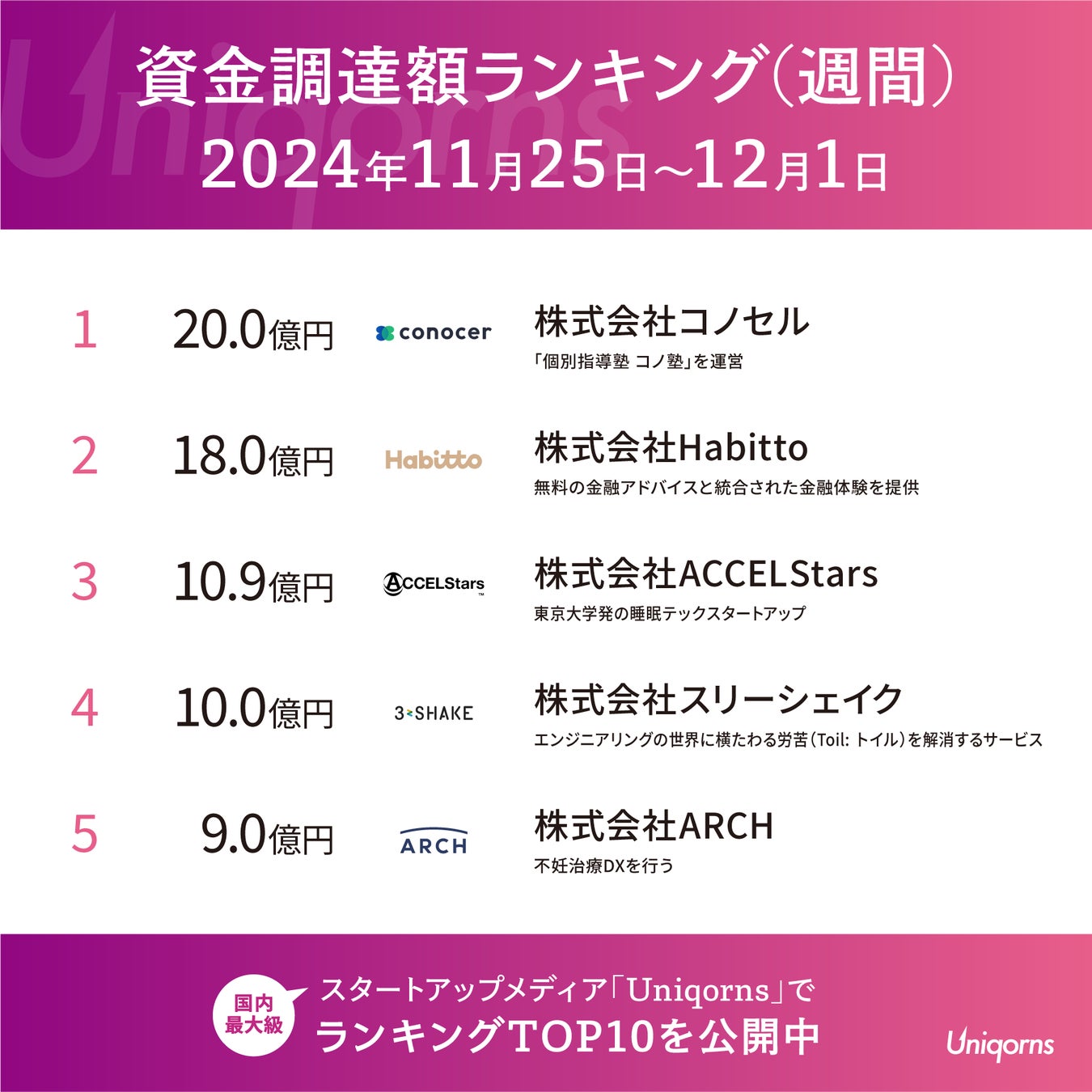 国内最大級のスタートアップメディア「Uniqorns(ユニコーンズ)」が2024年11月25日〜12月1日のスタートアップ資金調達状況をランキング形式で発表