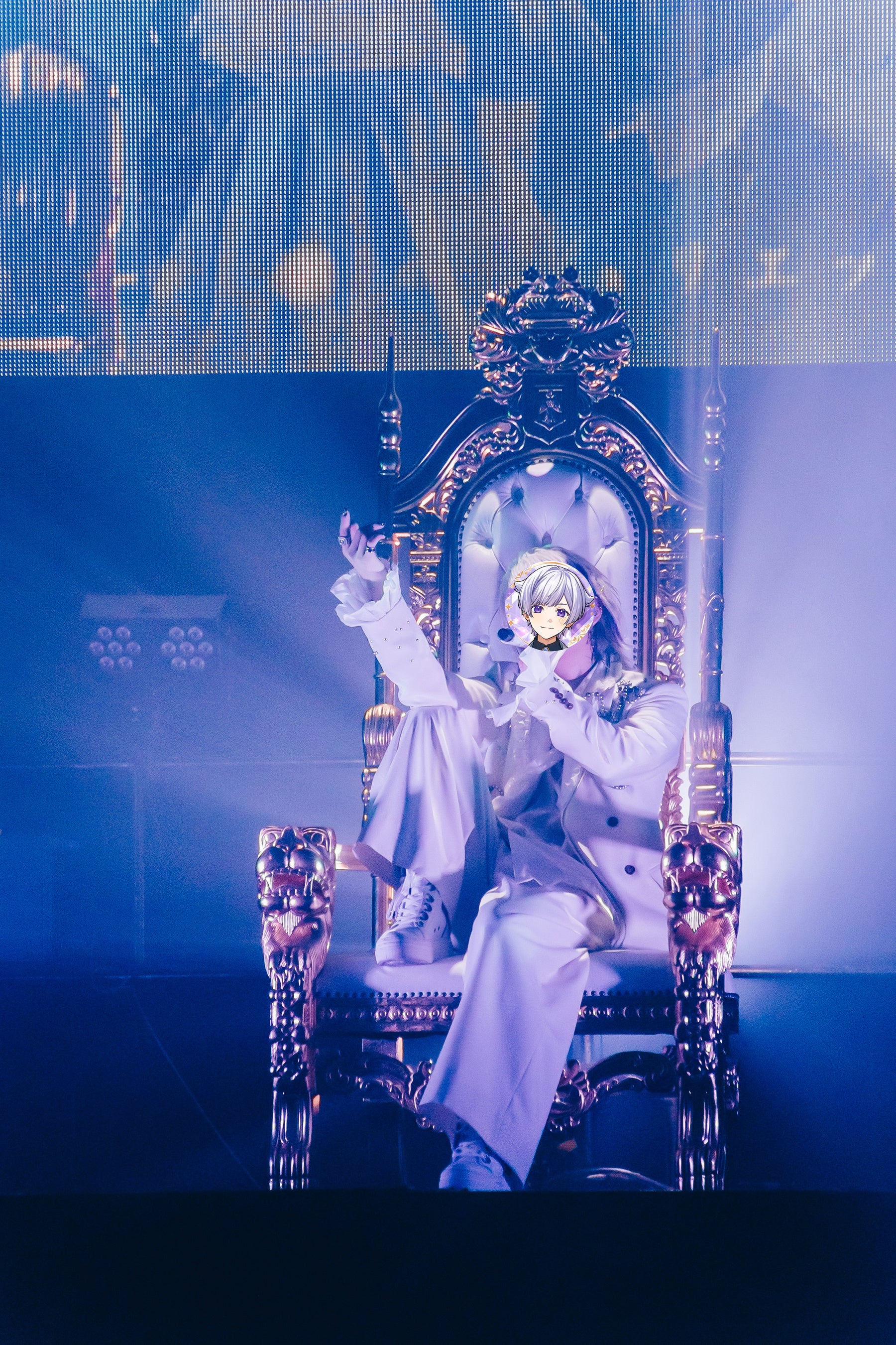 黒龍がオーディエンスを王城へ誘うオープニング映像により、一気に場内は神聖な雰囲気に。スクリーンのなかの初兎に目を奪われていると、舞台上に3次元の本人が登場した。玉座に堂々と腰をかけながら、ライブリード曲である「EreboSs」をドロップ。柔らかさと鋭さを巧みに使いわけ、『LAST EDEN』の世界観を描きだしていく。イメージビジュアルのような衣装を身にまとい、照明を指先で操る姿は、まさにカオスから発生した闇の神・Erebosのよう。続く「ReinE」でスクリーンに本人が映し出されると、客席は一段とヒートアップ。淀みのないモーション、バラエティー豊かな声色、計算された顔の角度など、彼の一挙手一投足がみにうさー(初兎のファン呼称)の心を打ち抜いていく。口に指を当て《shh…》とした際には、恍惚の悲鳴が豊洲PITを埋め尽くした。