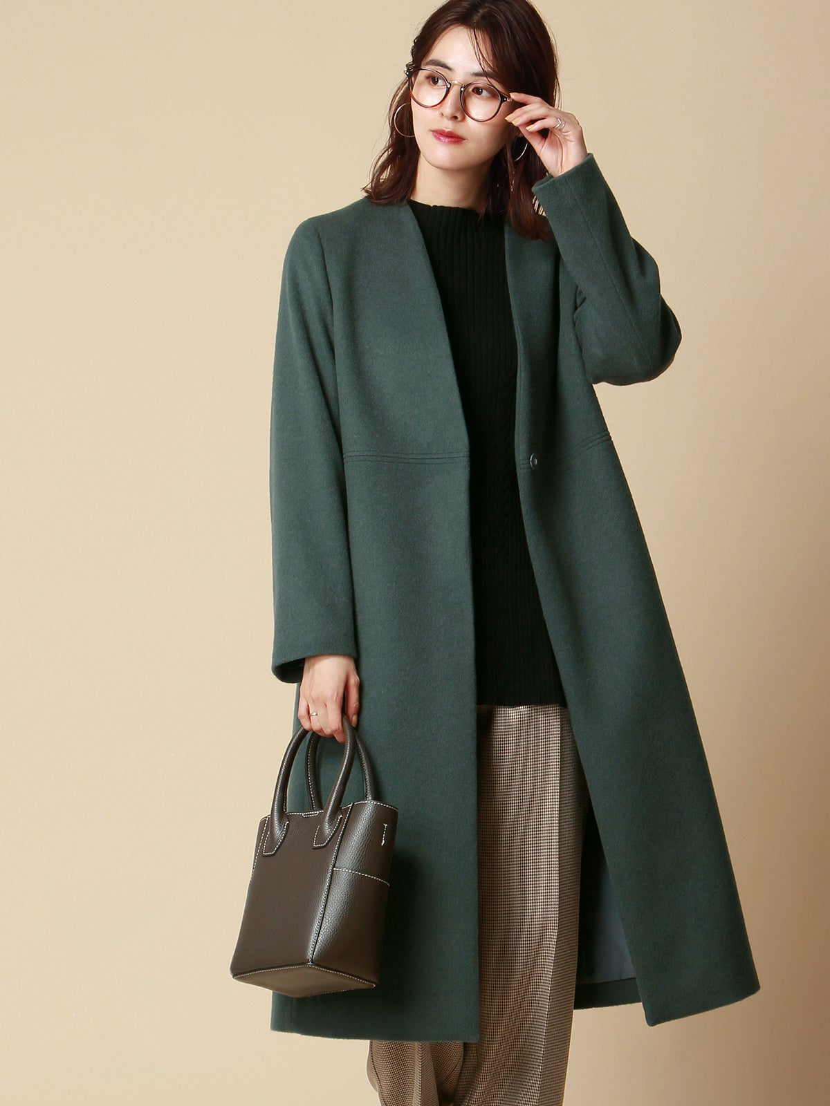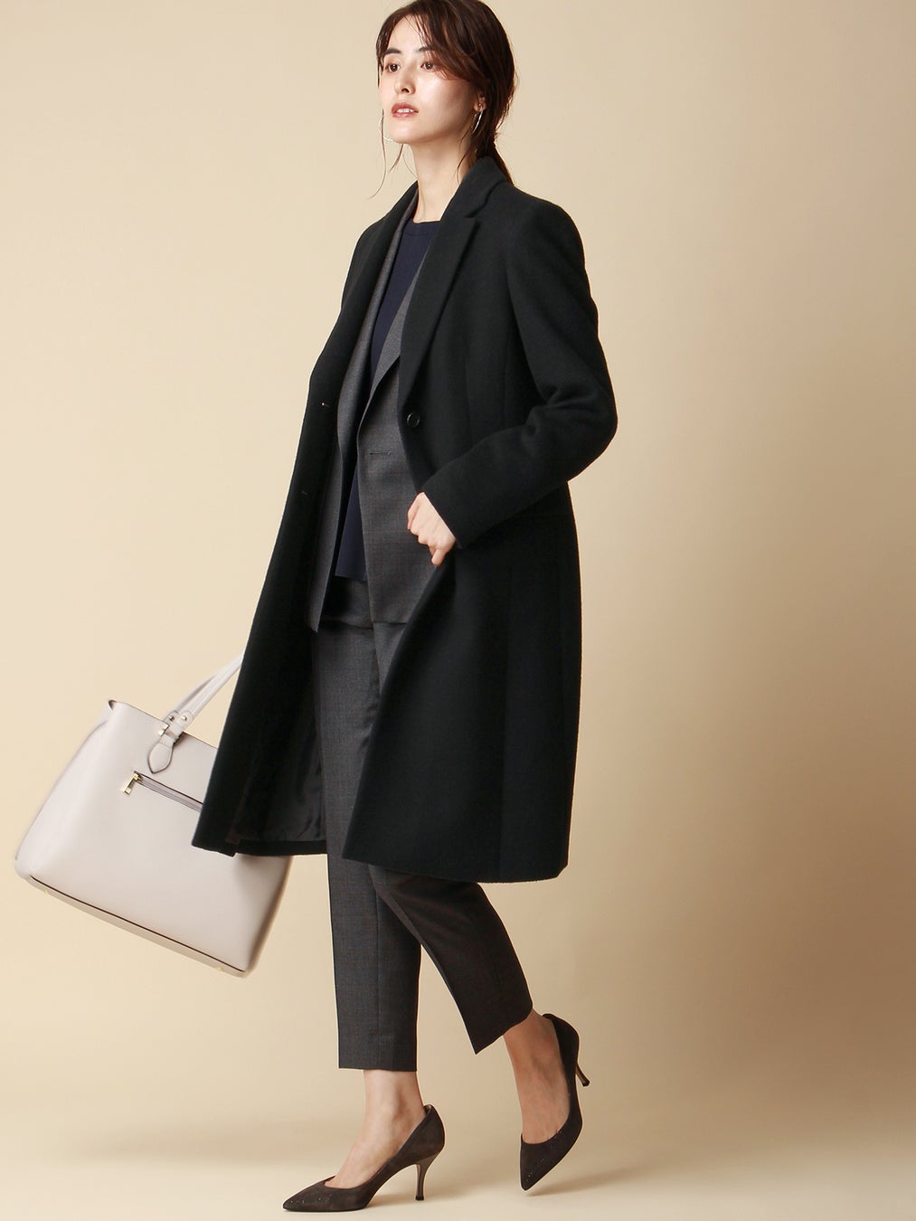 今回のコートは、程よいビッグシルエットにしており、トレンド感が感じられ、オフでも着やすいデザイン性がポイントです。後ろウエストに付けたバックベルトが後ろ姿のアクセントになり、ベルト付のコートのベルトの処理に困る、毎回ベルトを結んだりするのが煩わしいという方にもオススメです。また、ダブル以外にもチェスターコートとノーカラーコートを同じ原料で用意しています。