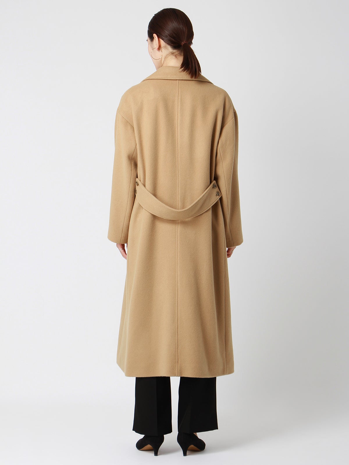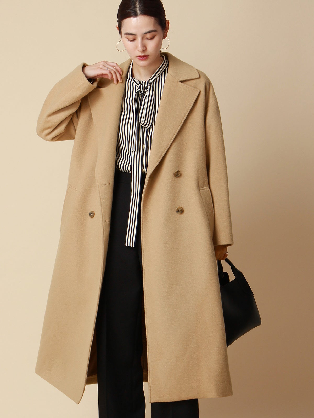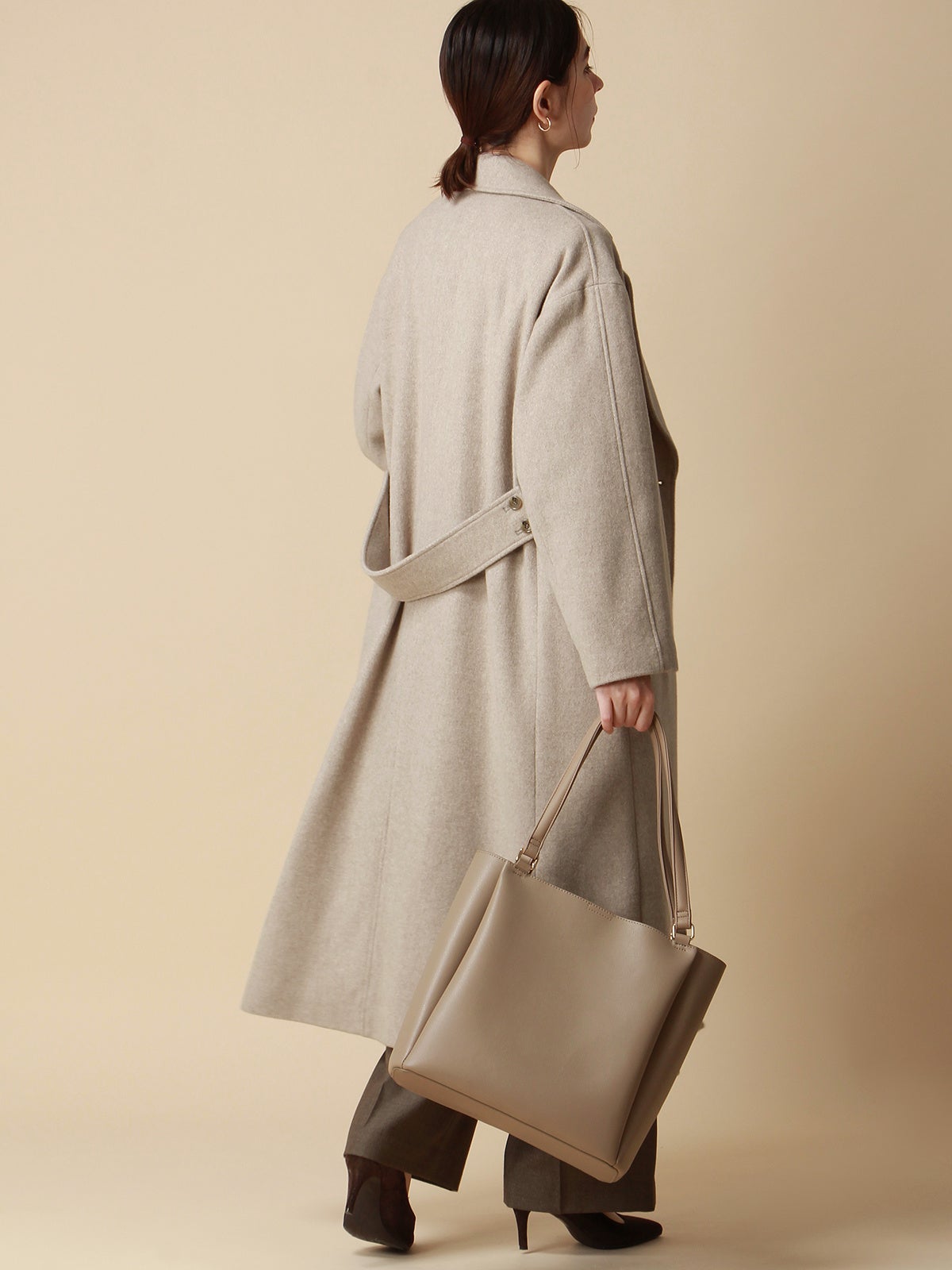 デザインはたっぷりとしたオーバーサイズで、こなれた印象のダブルコートです。また、「ベルトの扱いに困る」というお客様の声をもとに、サイドをボタンで留めるバックベルト仕様にすることで、扱いやすく、後ろ姿のアクセントになります。カラーは、長い間愛用できる定番ネイビー、気品漂うキャメル、柔和な空気感を漂わせるグレージュを用意しています。コートは、ダブル以外にもチェスターコートとノーカラーコートを同じ原料で企画しています。
