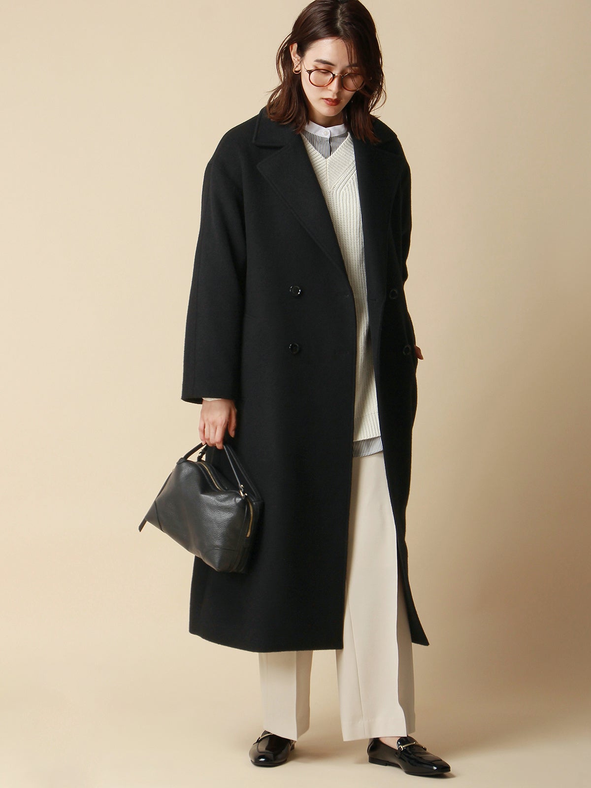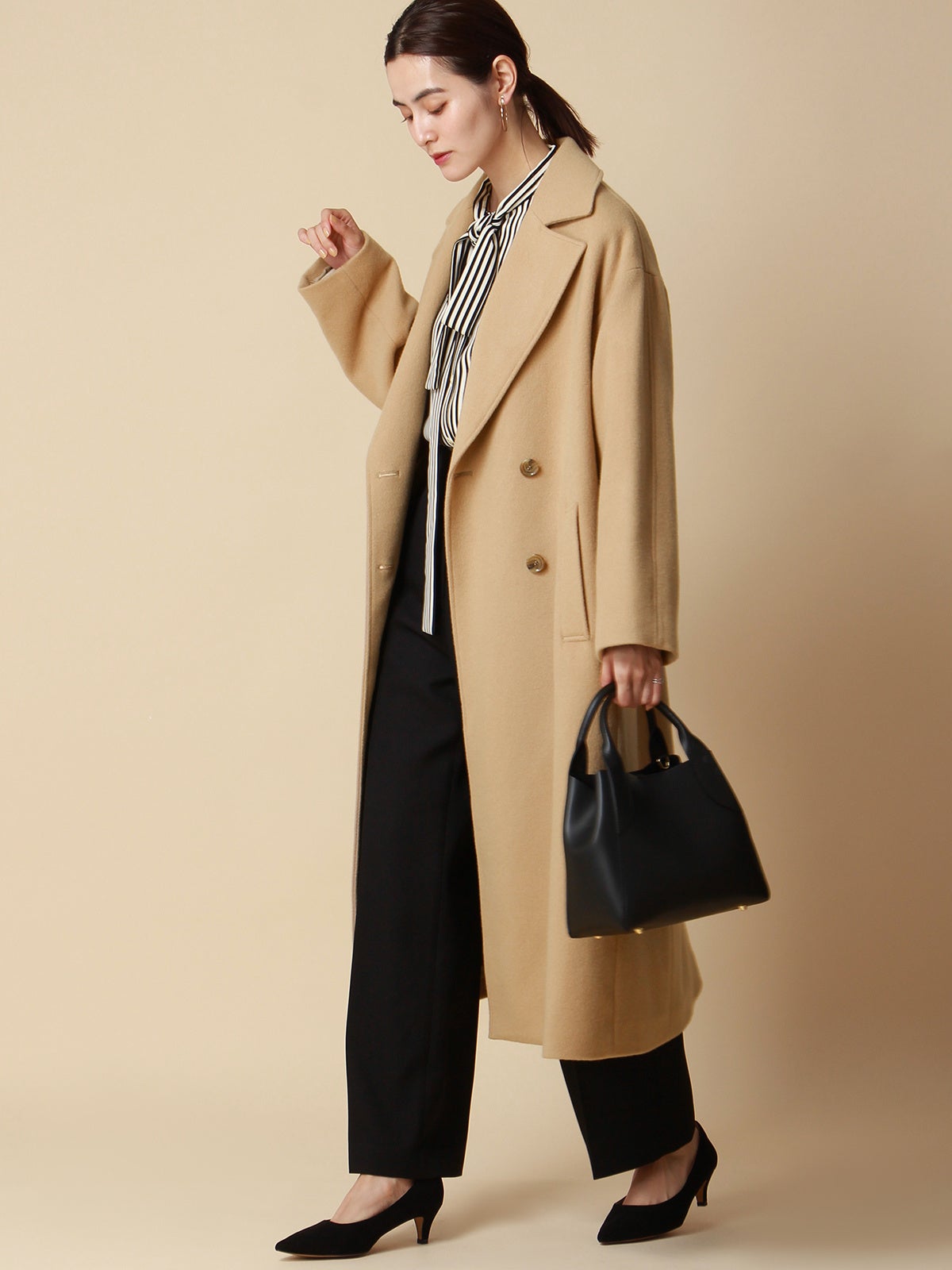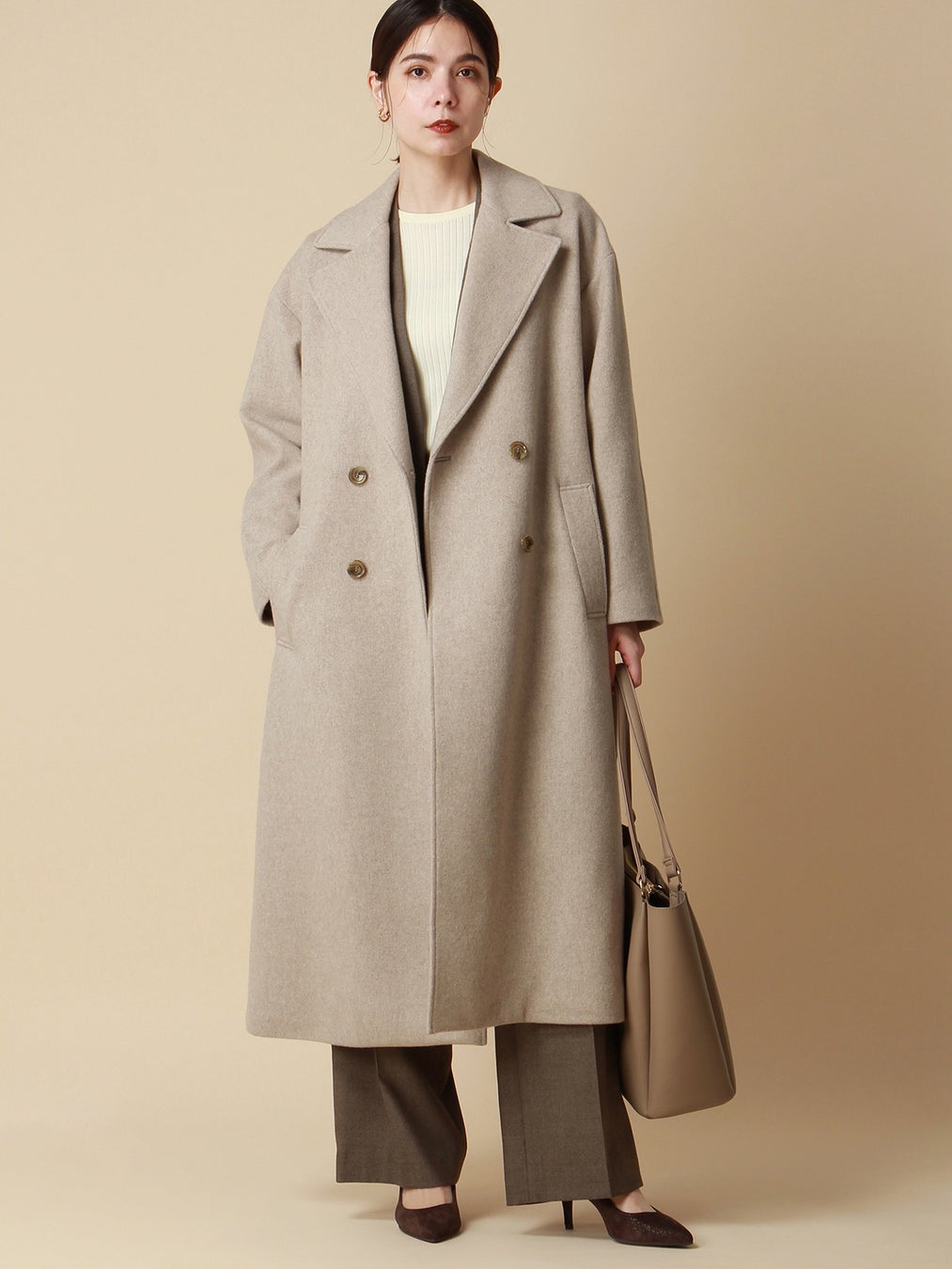 デザインはたっぷりとしたオーバーサイズで、こなれた印象のダブルコートです。また、「ベルトの扱いに困る」というお客様の声をもとに、サイドをボタンで留めるバックベルト仕様にすることで、扱いやすく、後ろ姿のアクセントになります。カラーは、長い間愛用できる定番ネイビー、気品漂うキャメル、柔和な空気感を漂わせるグレージュを用意しています。コートは、ダブル以外にもチェスターコートとノーカラーコートを同じ原料で企画しています。