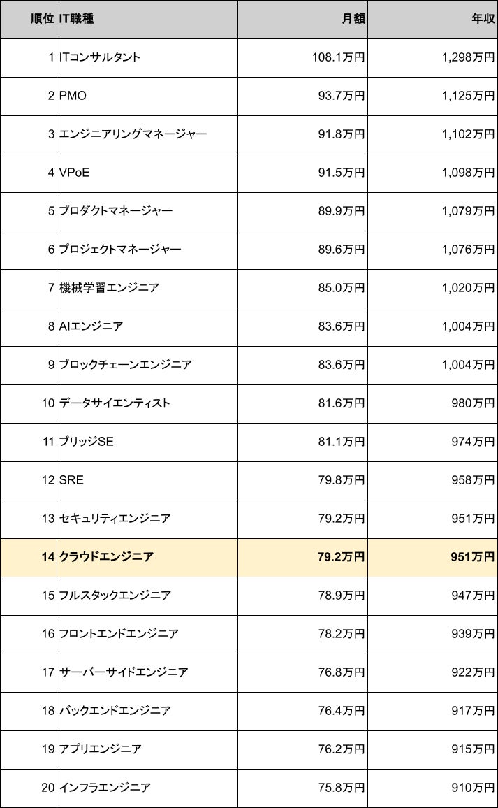 クラウドエンジニアの職種別平均年収ランキングは14位(951万円)