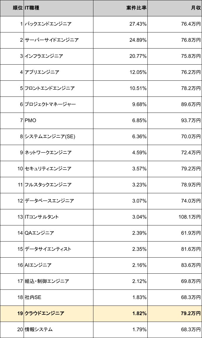 クラウドエンジニアの職種別案件数ランキングは19位(案件比率 1.82%)