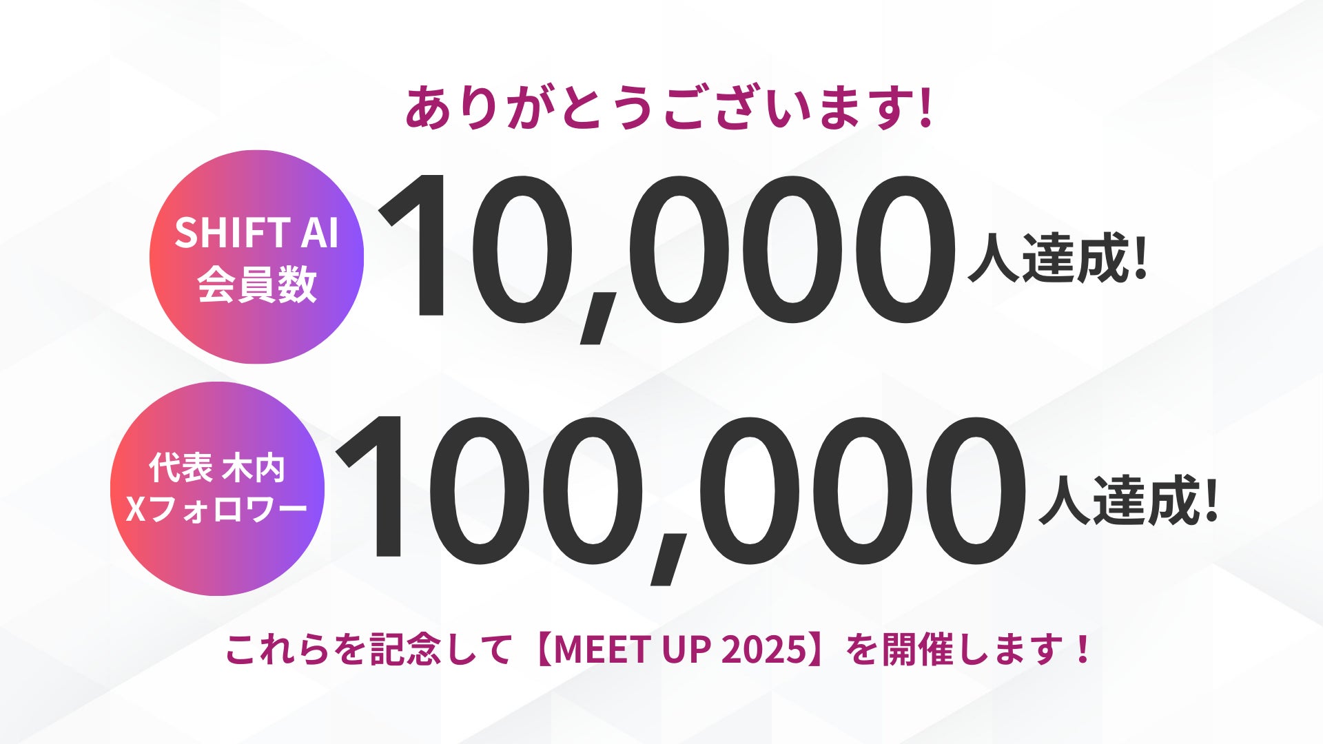 SHIFT AIコミュニティ会員1万人達成&代表 木内Xフォロワー10万人達成 1月21日に記念イベント【MEET UP 2025】を開催
