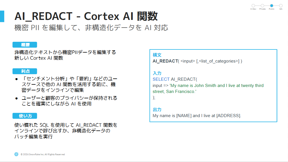 データのサイロ化解消に向けた「制限のないデータとAI対応」では、トランザクション処理と分析を統合する「Snowflake Postgres」と、オープンソース拡張機能「pg_lake」を紹介しました。これにより、PostgreSQLのワークロードをSnowflake上でシームレスに拡張できるようになりました。さらに、AI活用におけるセキュリティ機能として「AI_REDACT」を紹介しました。AI_REDACTは、入力テキスト内の個人情報(名前、年齢、住所など)をAIが自動検出し、マスキング処理を行う関数です。田中は「非常に魅力的なツール」と評価し、機密情報を扱う企業にとっての有用性を訴えました。また、1月に発表したGemini 3のSnowflake Cortex AI への導入を含む多様なLLMへの対応により、企業が最適なモデルを選択できる環境が整った点にも触れ、プラットフォームとしての進化を印象付けました。