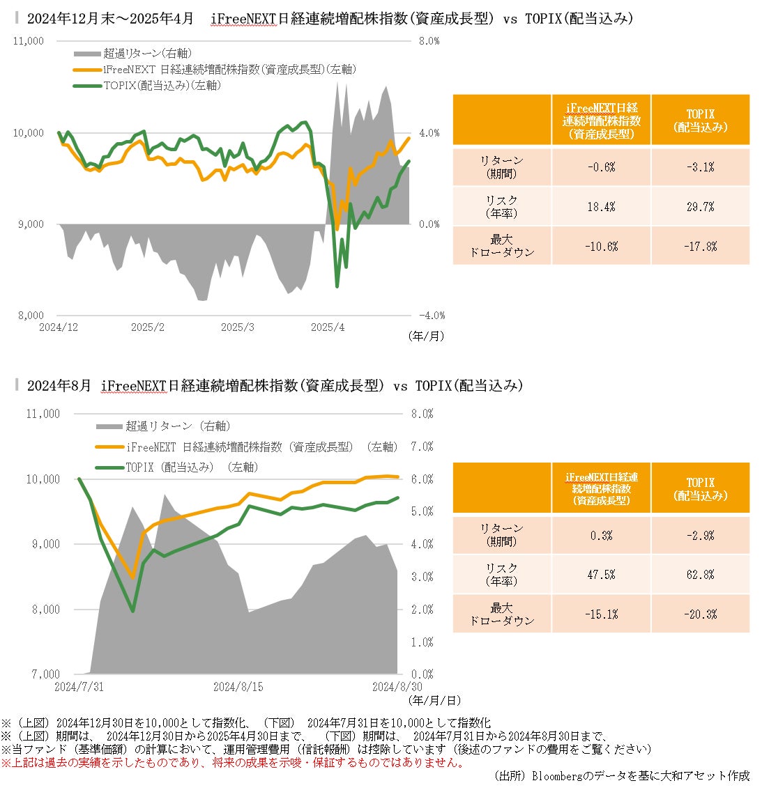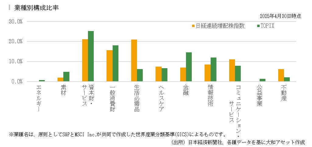 2025年4月のような市場が大きく調整する局面では、日経連続増配株指数の特徴の1つである下値抵抗力が力を発揮します。TOPIX対比で年初からパフォーマンスが劣後していたものの、大きな調整が発生したタイミングで超過リターンがプラスに転じました。