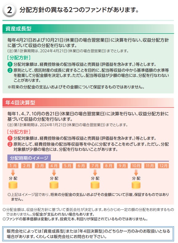 分配金は収益分配方針に基づいて委託会社が決定します。あらかじめ一定の額の分配をお約束するものではありません。分配金が支払われない場合もあります。