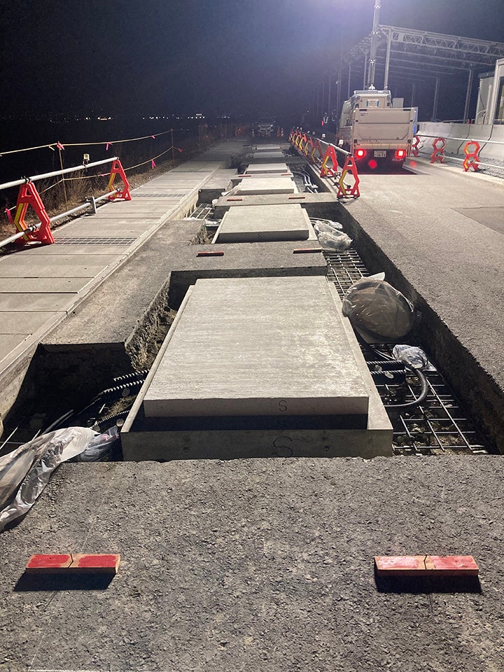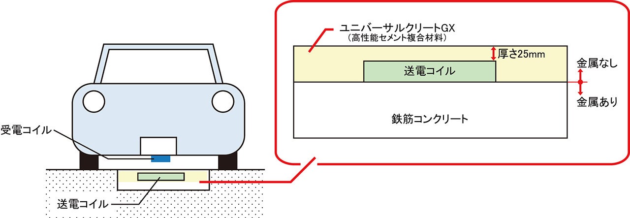 本実証では、送電コイルの上面にユニバーサルクリートGXを被覆したプレキャストコイルユニットを製造し、道路に埋設しました。 送電コイル上面を覆うユニバーサルクリートGXの舗装厚さはわずか約25mmで通行車両の重量に耐えることができ、給電効率にも貢献します。