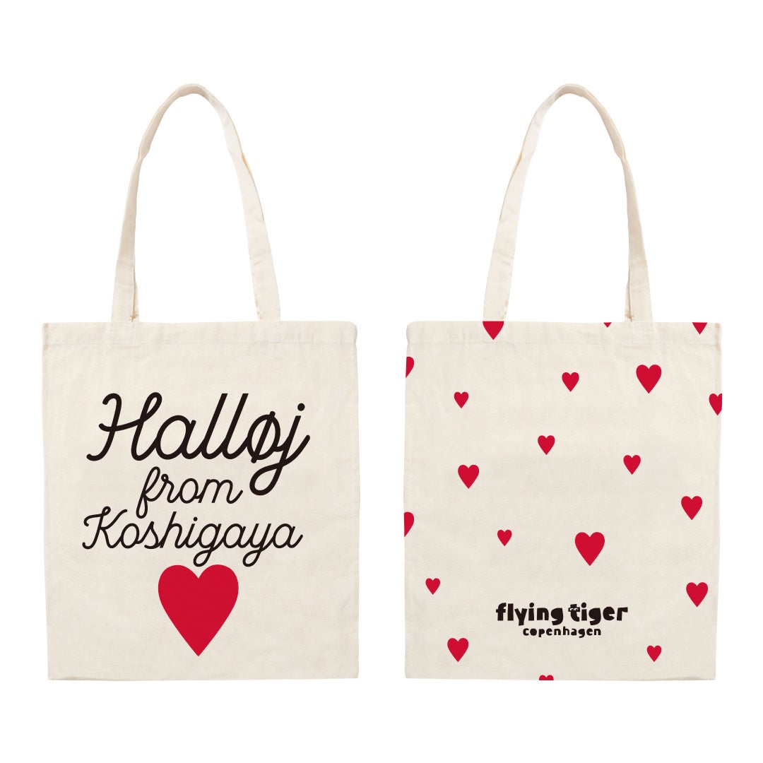 限定アイテム『ストアリミテッドバッグ』オープン日 先着100名様にプレゼント!Flying Tiger Copenhagenでは、各店限定の『ストアリミテッドバッグ』を販売しています。〈イオンレイクタウンkazeストア〉では、デンマークの人たちが大好きなモチーフ”ハート”と、メッセージ“Halløj from Koshigaya” (デンマーク語で「越谷からこんにちは!」)を配したバッグを展開。2/21(金)のオープン日、先着100名様に、この『ストアリミテッドバッグ』をプレゼントします。