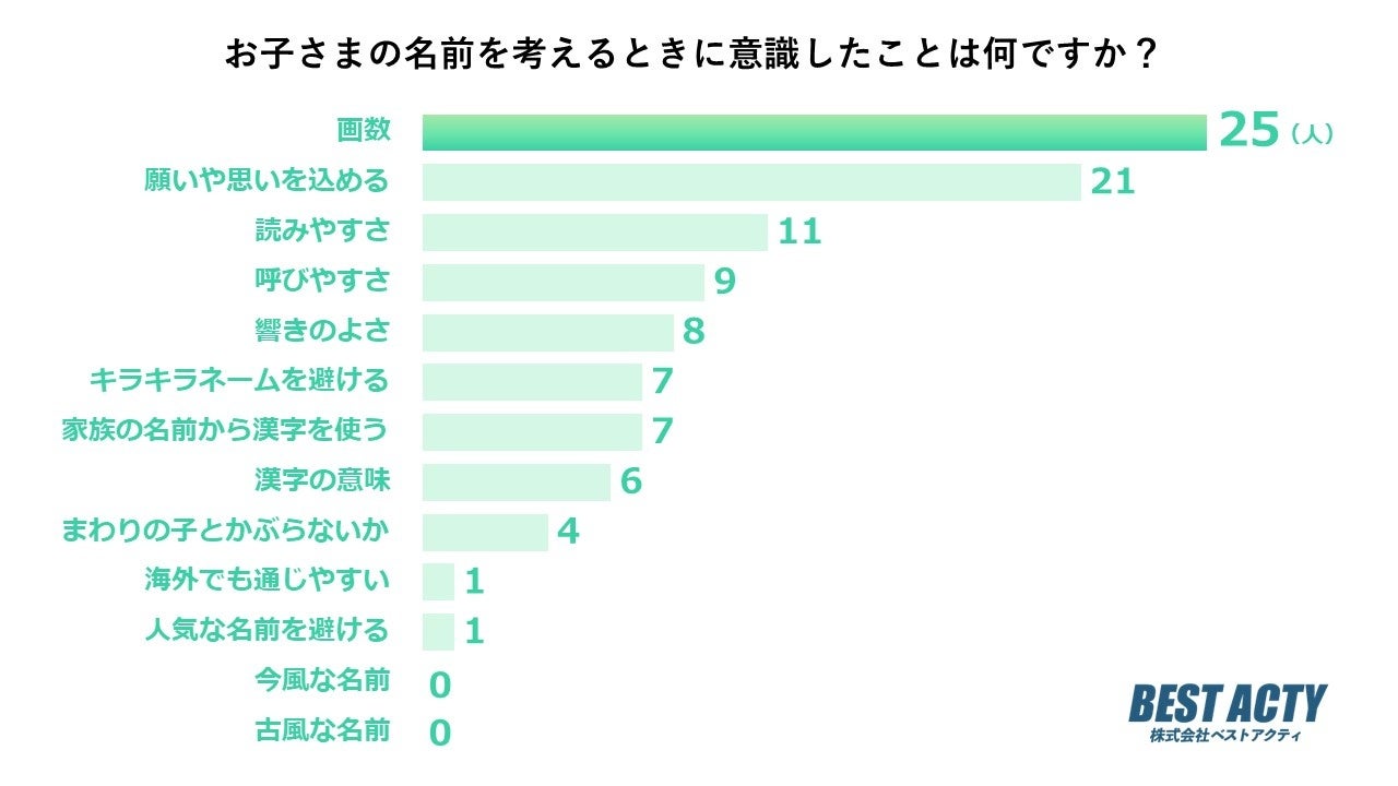 子どもの名前を考えるときに意識したことについて100人にアンケートを行ったところ、「画数」と回答する人が最も多い結果となりました。