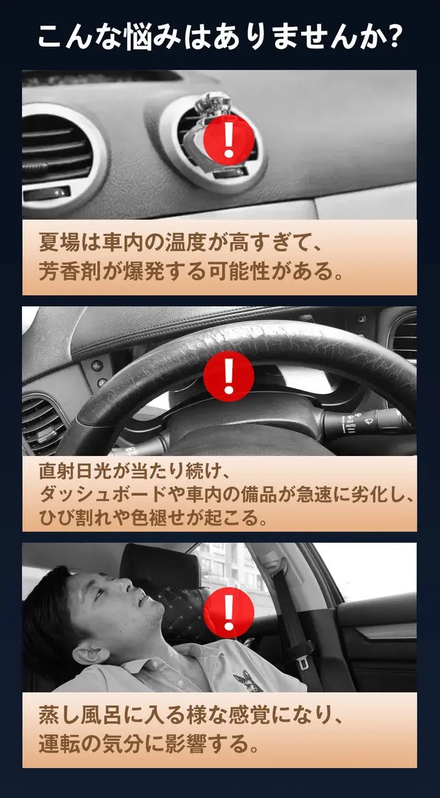 暑い夏の日、車内の温度上昇、内装の劣化、紫外線のダメージが心配です。しかし、このサンシェードはチタンシルバーのドット設計で効率的に温度の上昇を抑制します!