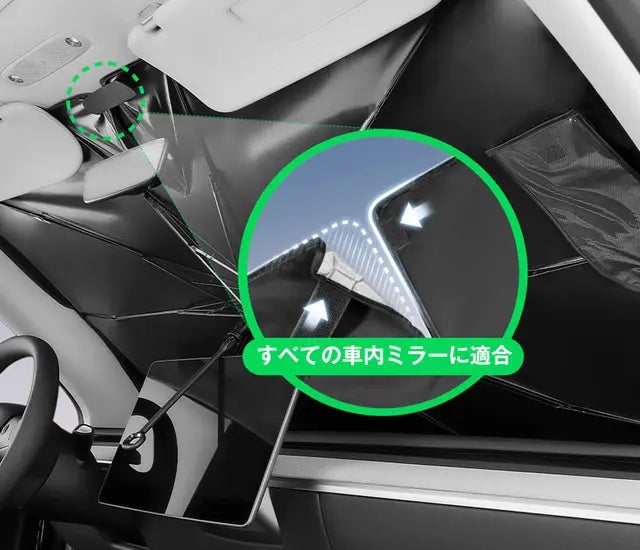 シンプルなデザインで、①シェードを開く、②フロントガラスに設置する、この2ステップで誰でも短時間で簡単に取り付けができます。
