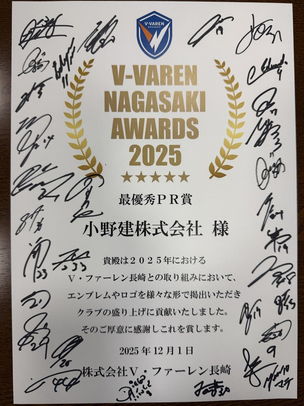 小野建株式会社(以下「当社」)は、2026シーズンもV・ファーレン長崎(以下「同クラブ」)のパートナー企業に就任を決定しました。また、当社は同クラブより最優秀PR賞として表彰を受けました。