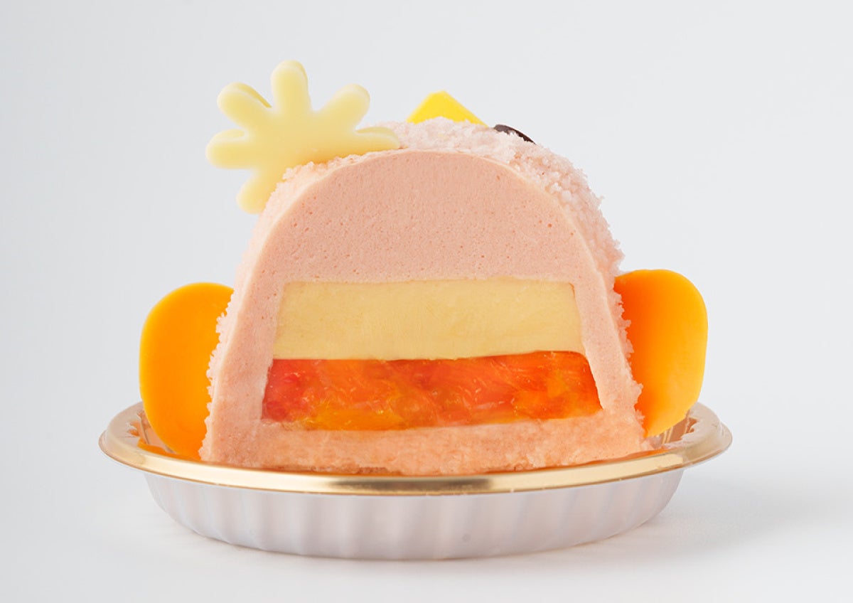 ほんのり甘い桃のババロアに、名古屋コーチン卵の濃厚プリンを合わせた、やさしい味わいの一品です。春日井特産のサボテンのパウダーを使ったクラムや、ピンクの羽とお花型のチョコレートがあしらわれたキュートな見た目も魅力的です。アトリエ店だけの限定ぴよりんを、ぜひお見逃しなく!