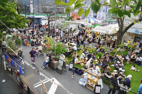 歩行者天国にした道路に人工芝を敷き、その上で本を読めるなど、普段の図書館では味わえない特別な体験ができます。また、宮前区内を中心とした美味しいお店が特別に駅前に出店します。