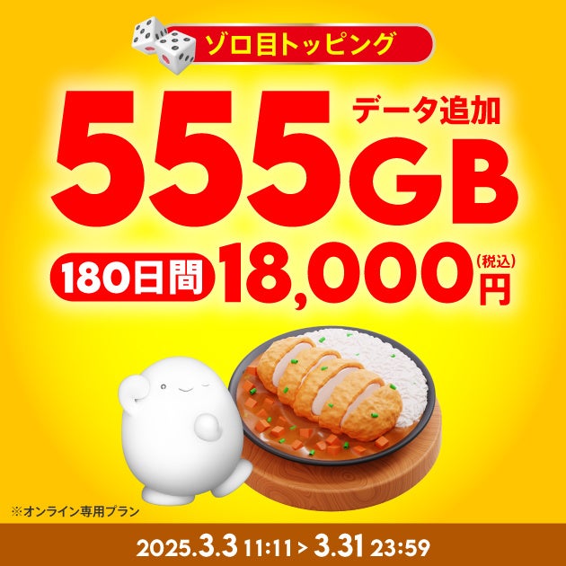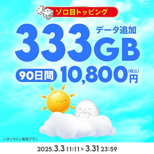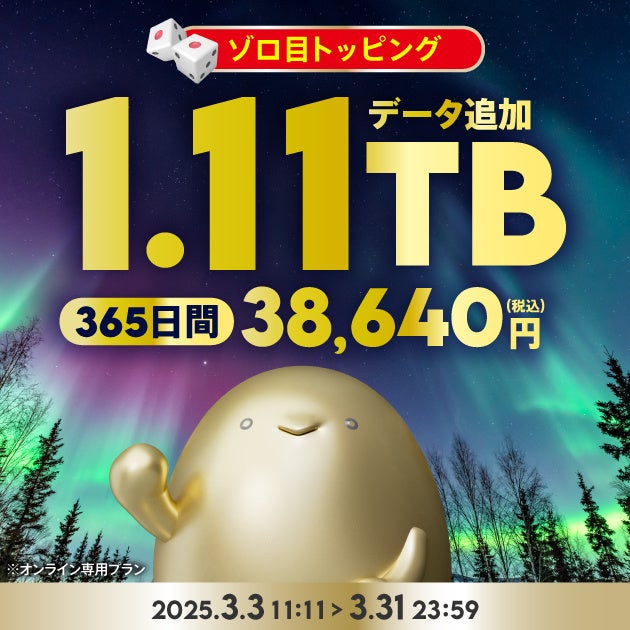 KDDI、沖縄セルラーは2025年3月3日から3月31日まで、povo2.0の期間限定トッピングとして、「1.11TB(365日間)38,640円」、「555GB(180日間)18,000円」、「333GB(90日間)10,800円」の「ゾロ目トッピング」を提供します。ゾロ目のデータ容量で新生活をちょっと楽しく始められるトッピングです。