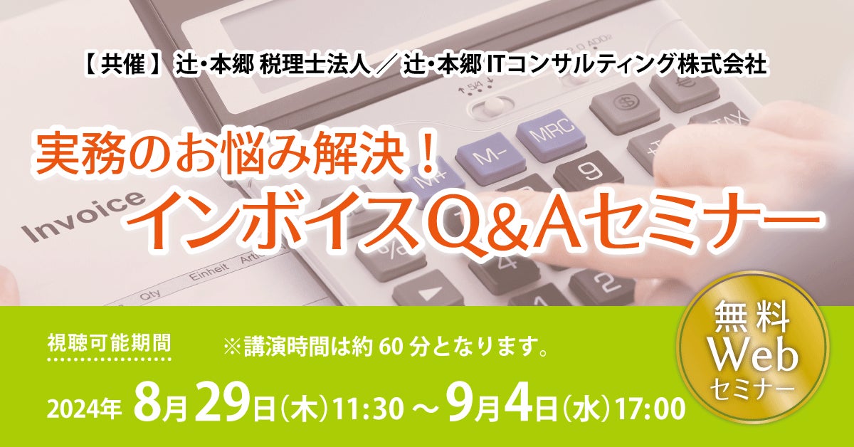 辻・本郷 税理士法人(本社:東京都新宿区、理事長:徳田孝司)は、辻・本郷 ITコンサルティング株式会社(本社:東京都渋谷区、代表取締役社長:黒仁田健)と2社共催で「実務のお悩み解決!インボイスQ&Aセミナー」を開催いたします。本セミナーでは、ご好評いただいた過去セミナーの内容に税制改正の内容を新たに追加し、実務の現場でよくある質問・疑問に回答します。また、インボイス制度対応には現状の業務フローの見直しやシステムの活用も有効です。中小企業から大企業まで、さまざまなお客様の課題解決のご相談を行ってきた辻・本郷 ITコンサルティングの専門家が、経理業務を効率化するノウハウをシステム活用事例と共にご紹介します。